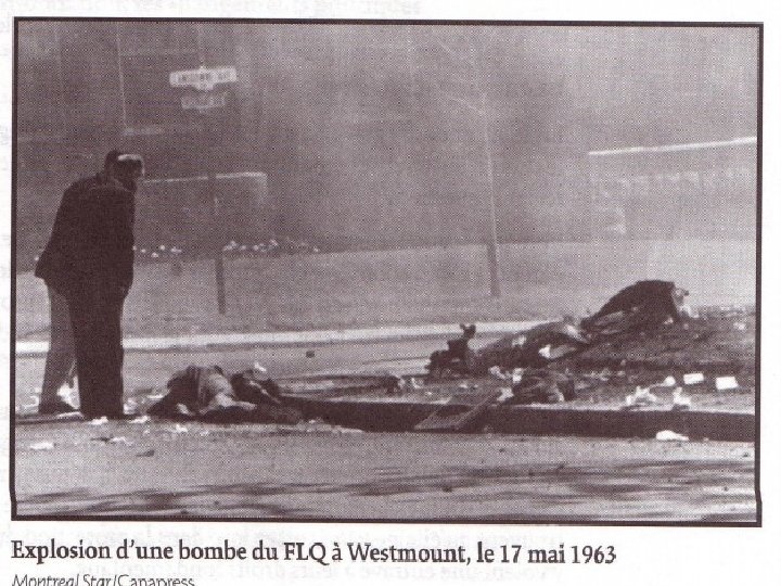Mouvement politique de gauche : Groupes socialistes. On propose l’indépendance. RIN fondé en 1960 (Pierre Bourgault en est le président). Parti Pris (1963 -1968) revue. FLQ : premières bombes en 1963.