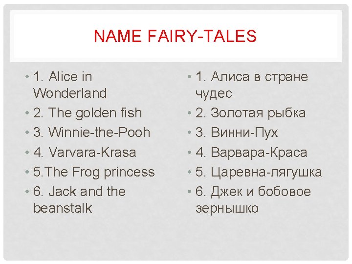 MATCH THE NAME OF FAIRY TALE AND THE COUNTRY IT COMES FROM English fairy tales Tales: Russian fairy tales Alice in Wonderland, The Frog Princess, Vassilissa the Beautiful, Jack and the Beanstalk , The Star Child, Golden Fish, Three bears, Tom Thumb, Goldilocks and Three bears, A Turnip.