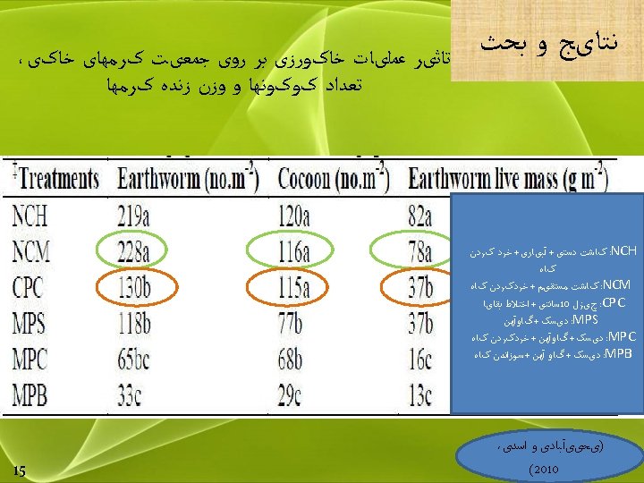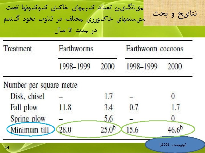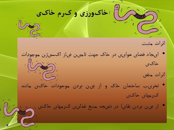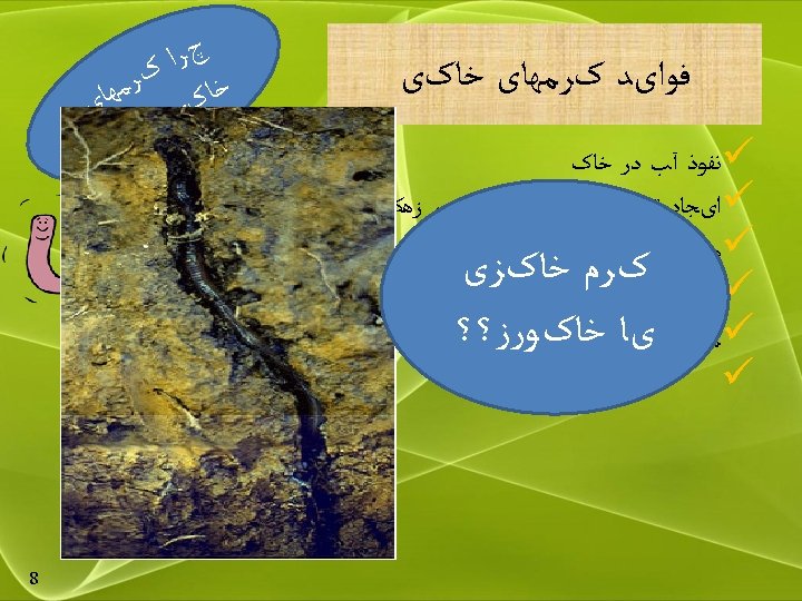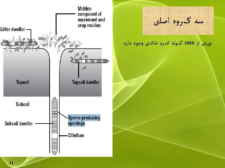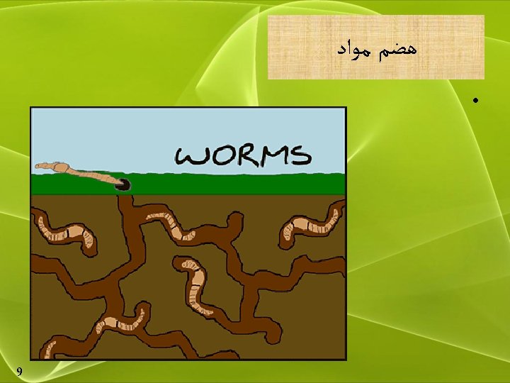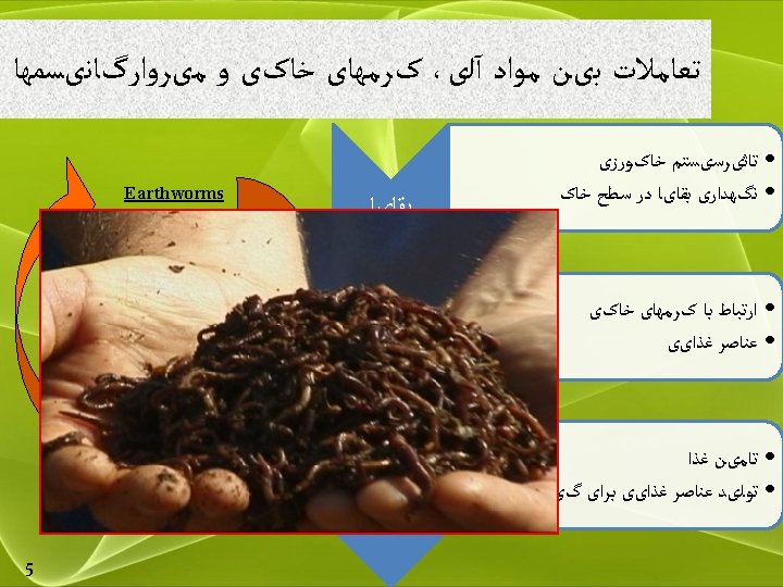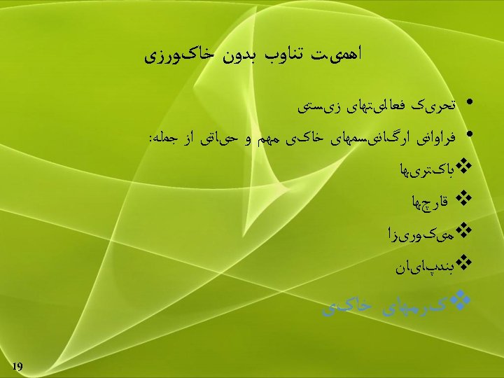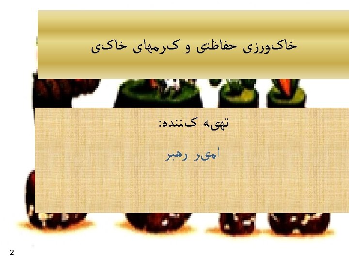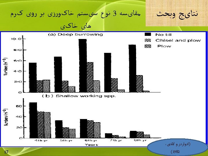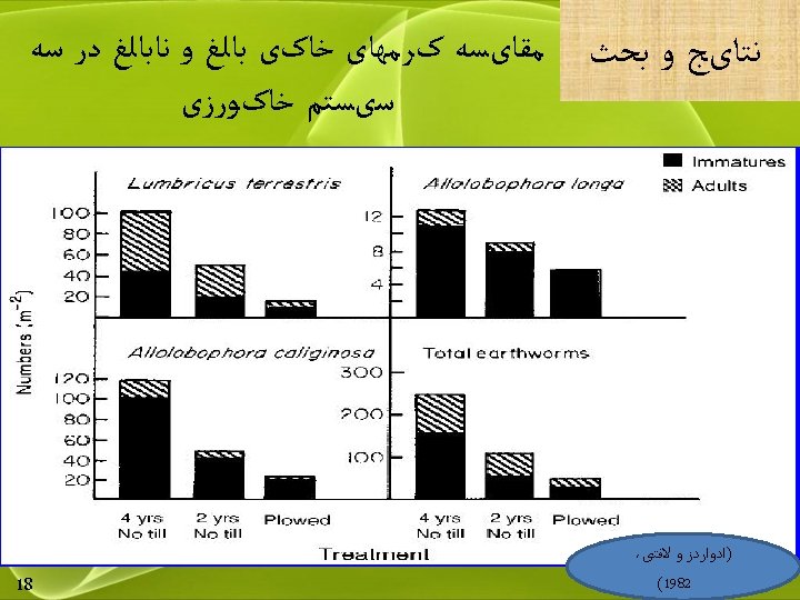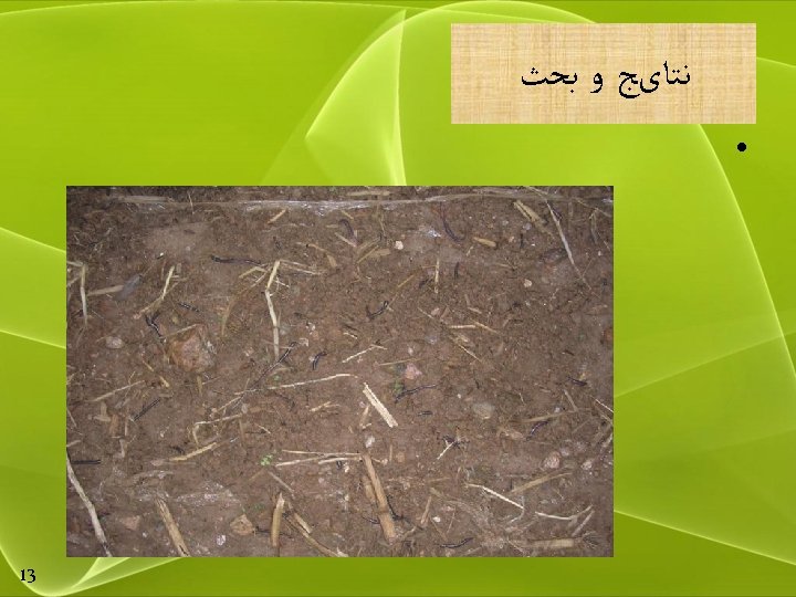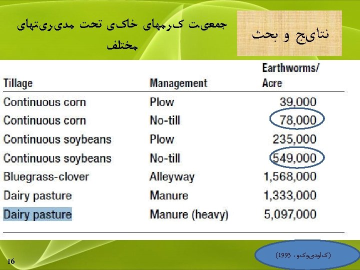 ﻣﻨﺎﺑﻊ 1. 2. 3. 4. 5. 6. 7. 22 Peigne´, J. , Cannavaciuolo, M. , Gautronneau, Y. , Aveline, A. , Giteau, J. L. and Cluzeau, D. 2009. Earthworm populations under different tillage systems in organic farming. Soil and Tillage Research. 104: 207 -214. Metzke, M. , Potthoff, M. , Quintern, M. , Heß, J. and Joergensen, R. G. 2007. Effect of reduced tillage systems on earthworm communities in a 6 -year organic rotation. European Journal of Soil Biology. 43: 209 -215. Wuest, S. B. 2001. Earthworm, infiltration, and tillage relationships in a dryland pea–wheat rotation. Applied Soil Ecology. 18: 187 -192. Yahyaabadi, M. and Asadi, A. 2010. Earthworm population response to tillage and residue management in central Iran. 19 th World Congress of Soil Science Australia. 55 -57. Edwards, C. A. and Bohlen, P. J. , The Biology and Ecology of Earthworms, Chapman and Hall, New York, 1996. Edwards, C. A. and Lofty, J. R. 1982. The effect of direct drilling and minimal cultivation on earthworm populations. Journal of Applied Ecology. 19: 723 -734. Tian, G. , Kang, B. T. and Brussaard. 1997. Effect of mulch quality on earthworm activity and nutrient supply in the humid tropics. Soil Biology and Biochemistry. 29: 369 -373.