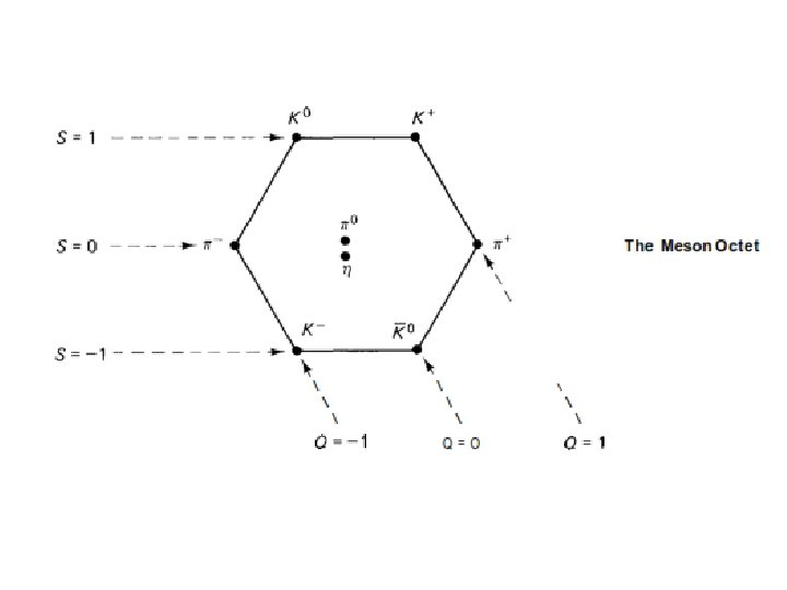 • Notice that particles of like charge lie along the downward sloping diagonal lines: Q = +1 (in units of the proton charge) for the proton and the S +; Q = 0 for the neutron, the lambda, the S o, and the X o ; Q = -1 for the S - and the X Horizontal lines associate particles of like strangeness: S = 0 for the proton and neutron, S = -1 for the middle line and S = -2 for the two X ’s. The eight lightest mesons fill a similar hexagonal pattern, forming the ( pseudoscalar) meson octet: