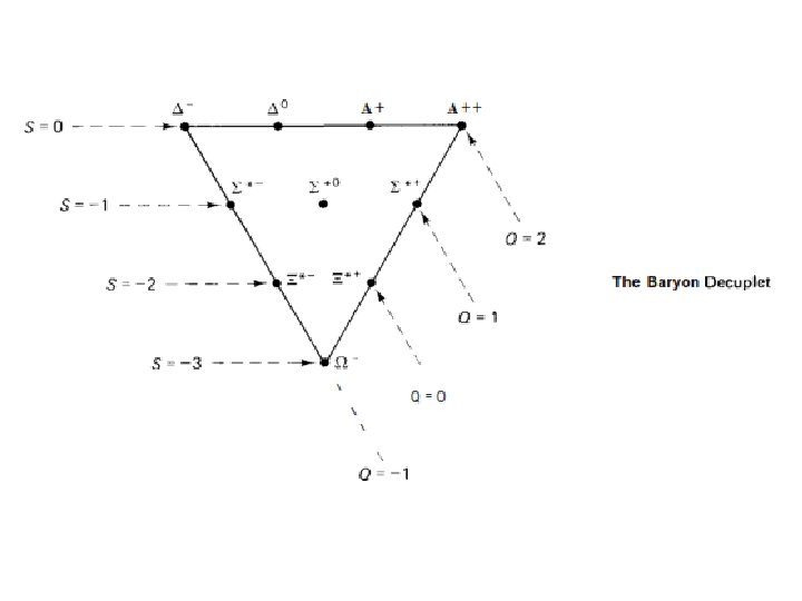 • Now, as Gell-Mann was fitting these particles into the decuplet, an absolutely lovely thing happened. Nine of the particles were known experimentally, but at that time the tenth particle the one at the very bottom, with a charge of - and strangeness 3 was missing: No particle with these properties had ever been detected in the laboratory. Gell-Mann boldly predicted that such a particle would be found, and told the experimentalists exactly how to produce it. More over, he calculated its mass and its lifetime, and sure enough, in 1964 the famous omega-minus particle was discovered, precisely as Gell-Mann had predicted (see Fig. 1. 10).