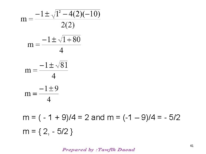Ex: Use the Quadratic Formula to solve 2 m 2 + m – 10 = 0 Recall: For quadratic equation ax 2 + bx + c = 0, the solutions to a quadratic equation are given by Identify a, b, and c in am 2 + bm + c = 0: a=2 b= 1 c = - 10 Now evaluate the quadratic formula at the identified values of a, b, and c 40