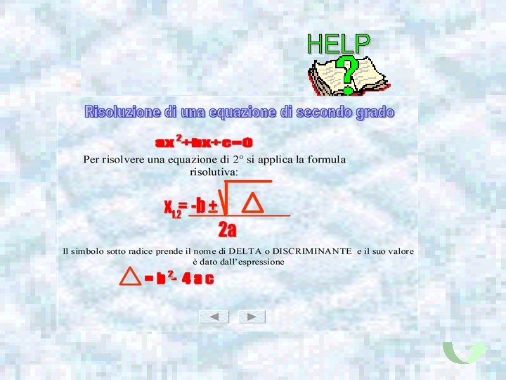 Per risolvere una equazione di 2° si applica la formula risolutiva: Il simbolo sotto radice prende il nome di DELTA o DISCRIMINANTE e il suo valore è dato dall’espressione