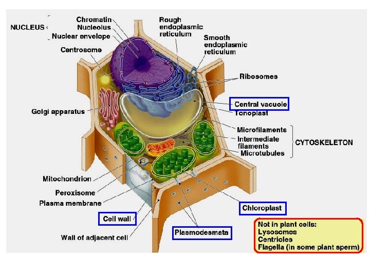 Comparison: Plant & Animal Cells • Differences – Plants have • Cell wall – provides strength & rigidity and is not found in animal cells. • Have chloroplasts that is photosynthetic and are not found in animal cells. – Animals have • Organelle lysosomes, centriols and flagella are not found in plants. • Centrioles have important role in cell division.