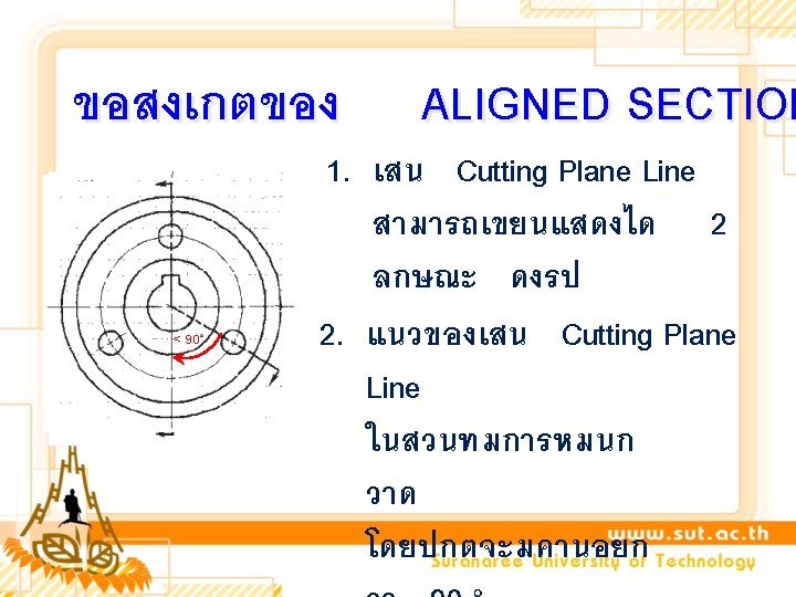 เนอหา ในสปดาห ท 1. Basic 8 of Sectioning 2. Section Line & Cutting Plane Line 3. Type of Section (Full Section / Half Section / Offset Section / Broken-out section / Aligned Section (Conventional Revolution) / Revolved Section / Removed Section) 4. Conventional Breaks 5. Rib, Web and Spoke