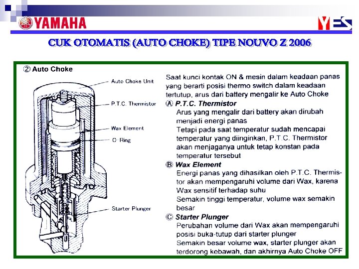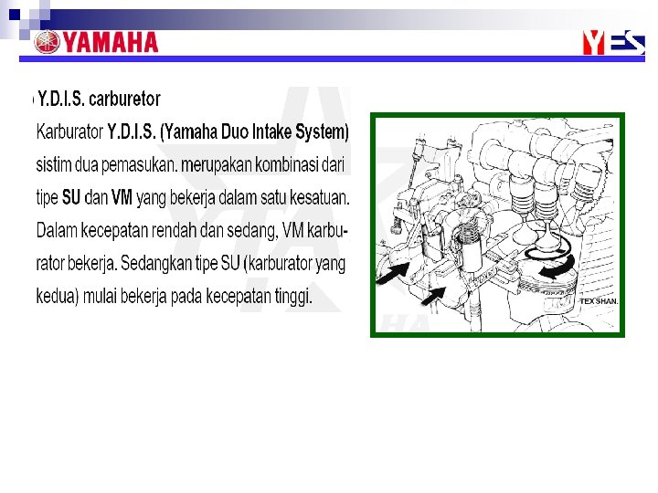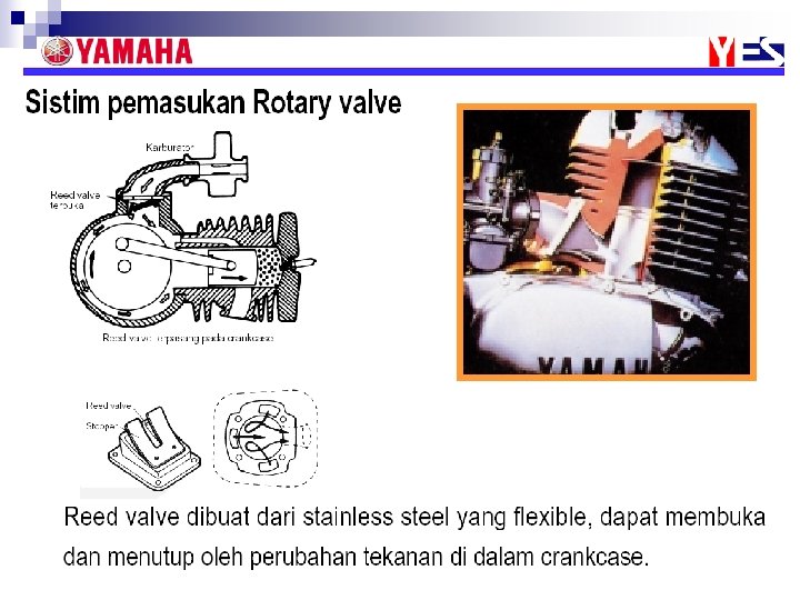 1. KELEBIHAN Efisiensi pemasukan lebih baik, dikarenakan hambatan gas pemasukan dapat dihilangkan. 2. STRUKTUR - Sebuah chamber ditempatkan diantara karburator dan reed valve. - Chamber merupakan ruang kosong. Berfungsi sebagai tempat menampung gas dari karburator yang akan berbalik dan membuat turbulensi gas pada lubang masuk. Apabila tanpa YEIS, turbulensi ini akan menghambat gas berikutnya yang akan masuk,