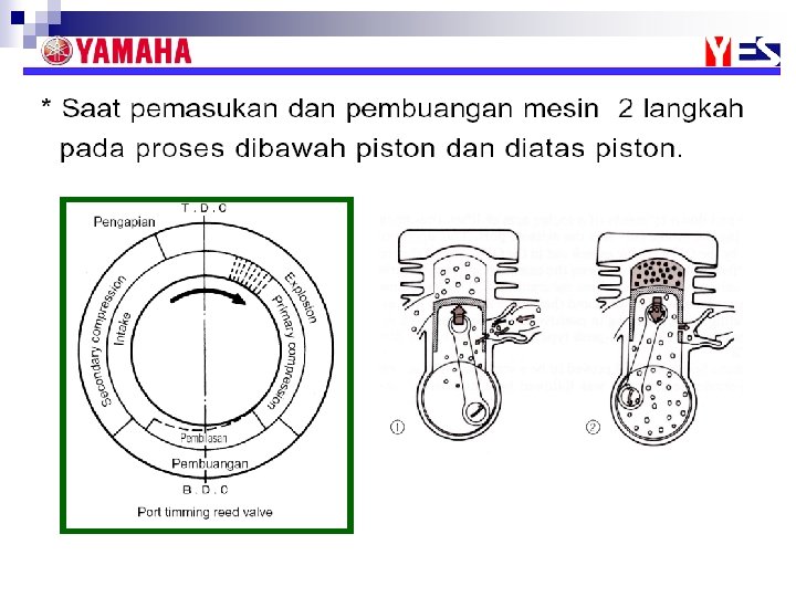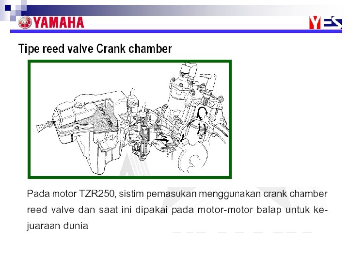 3. CARA KERJA - Jika reed valve mulai terbuka: Gas di dalam chamber akan mengalir ke crank case bersamaan dengan gas yang masuk dari carburator. - Jika reed valve menutup: Pada waktu piston menutup lubang pemasukan, terjadi gaya inersia gas yang berputar di lubang pemasukan yang akan masuk pada periode berikutnya. Gas yang berputar tersebut disimpan di dalam chamber.