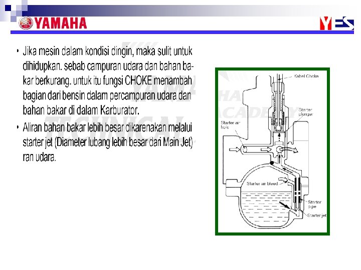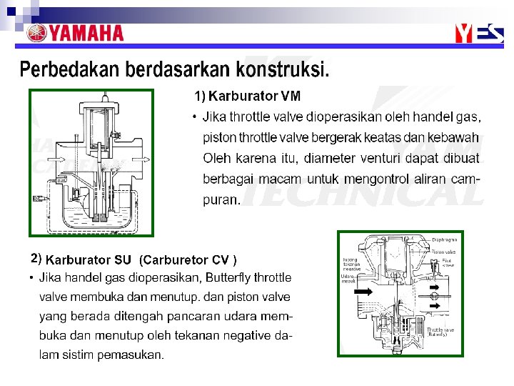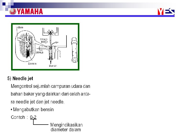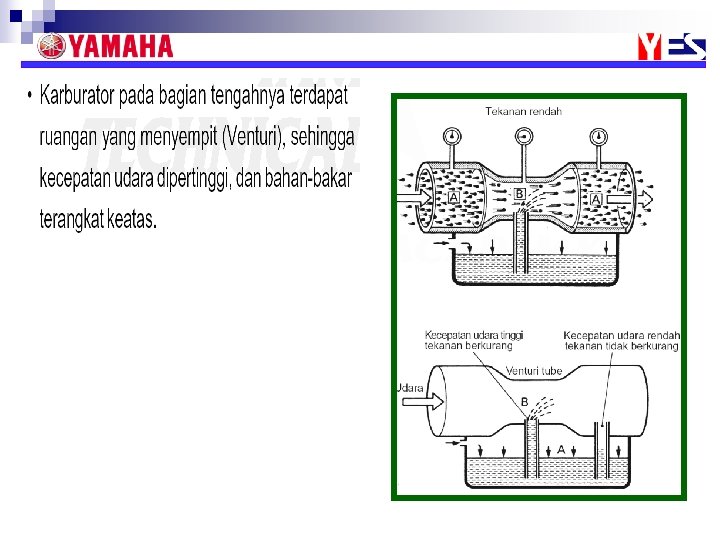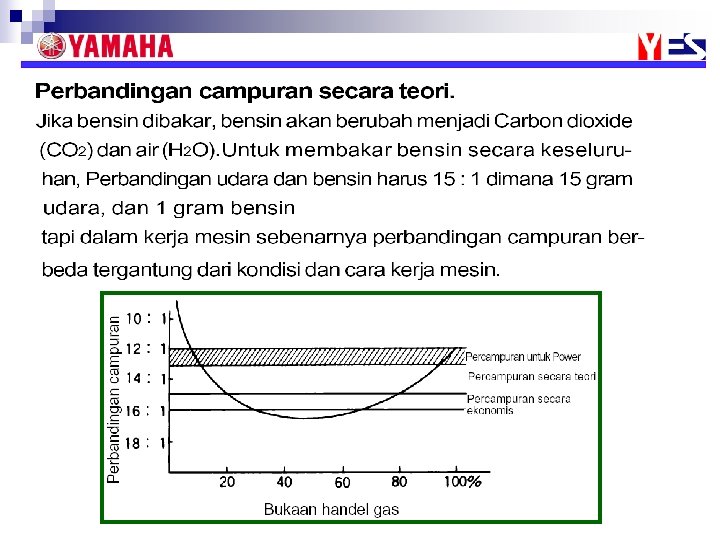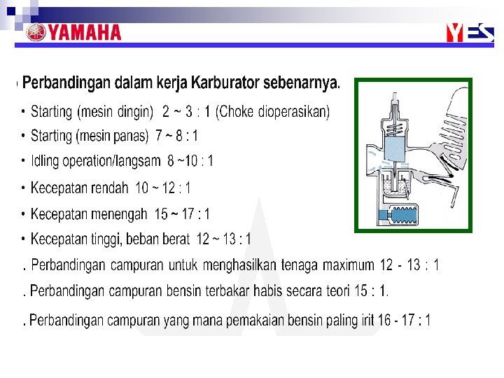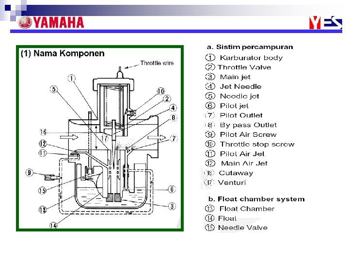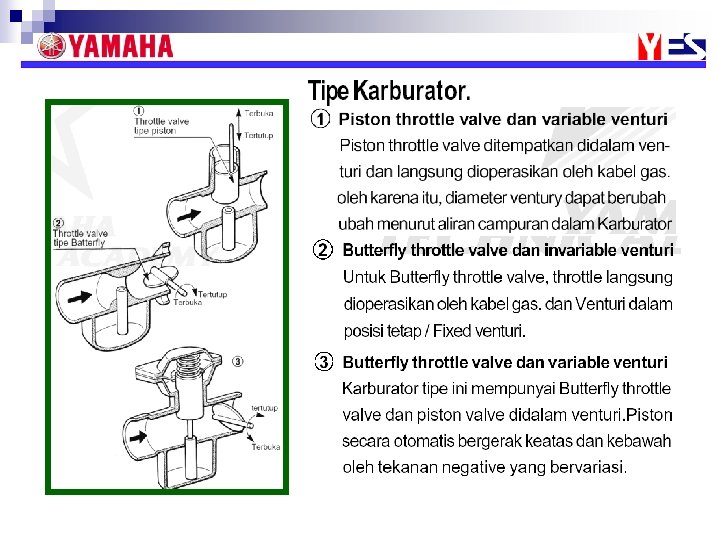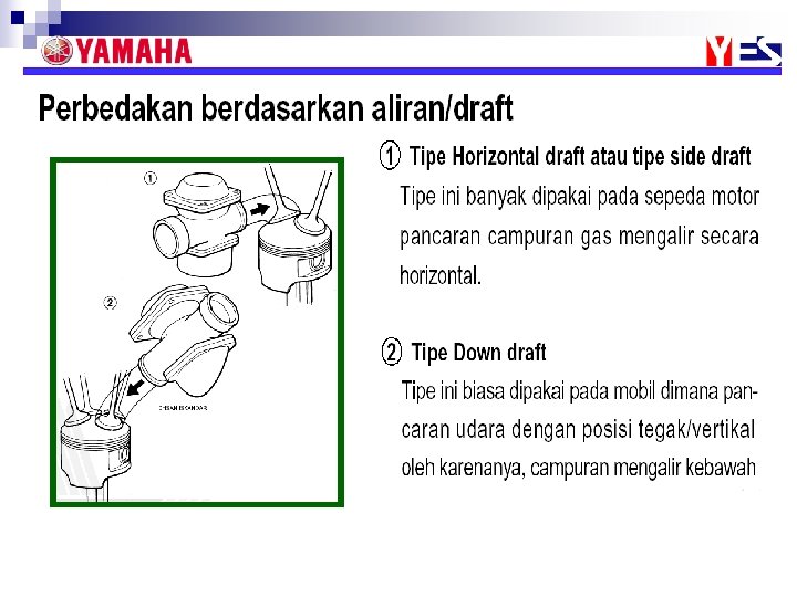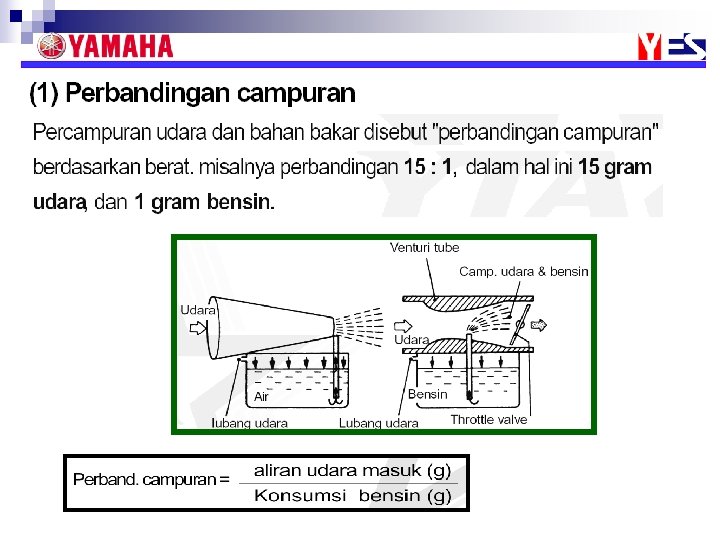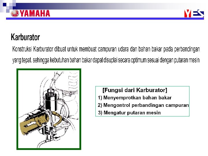 1. Kegunaan Karburator: Apabila bensin langsung dimasukan ke mesin tanpa karburator: - Tidak terjadi pembakaran. - Jumlah bensin yang dimasukan tidak terkontrol. 2. Diperlukan Karburator: a. Karburator membuat campuran udara dan bahan bakar dan mengatur putaran mesin. Mengontrol perbandingan campuran.
