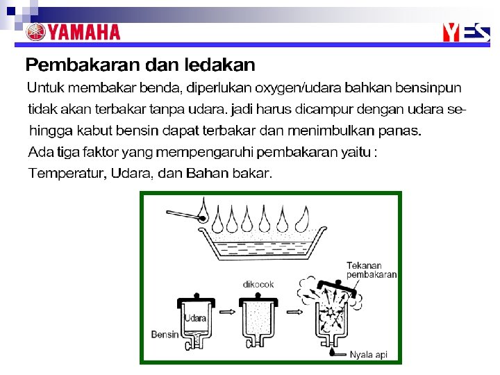 4. Aditif - Bahan pewarna: Untuk membedakan gasoline dari bahan bakar lain dengan mudah. - 4 ethyl lead: Untuk menambah angka oktan, mencegah pembakaran yang tidak diinginkan. 5. Penanganan Gasoline: - Jangan didekatkan dengan sumber api. - Ventilasi ruang penyimpanan baik. - Jangan biarkan menetes di bagian motor yang dilapisi/dicat. - Jangan biarkan menetes pada plastik dan karet pada motor.