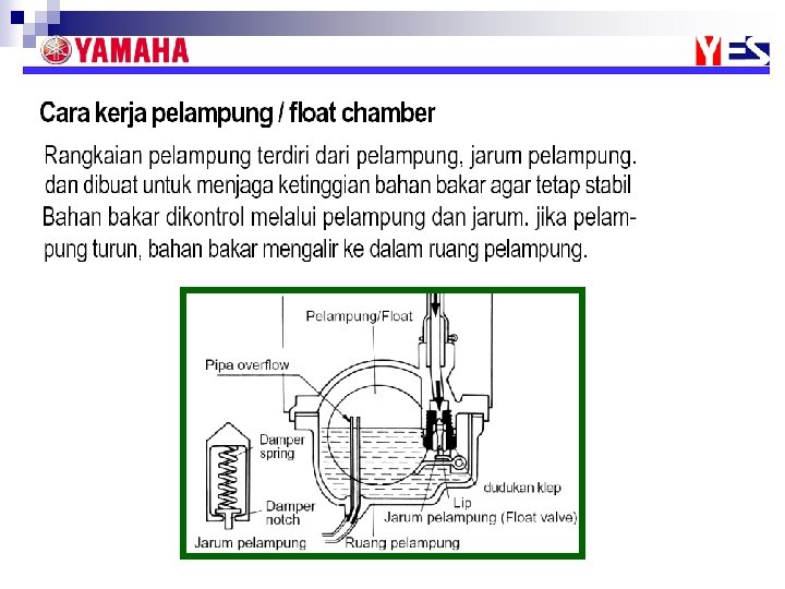 OVER FLOW (Kelebihan Aliran) Pelampung tidak dapat menahan ketinggian Bahan bakar: -Batas ketinggian bahan bakar terlalu tinggi. -Ada kotoran yang menahan float valve. PERCOLATION (Terlalu sedikit) -Mesin terlalu panas. -Timbul gelembung-gelembung di dalam bahan bakar.