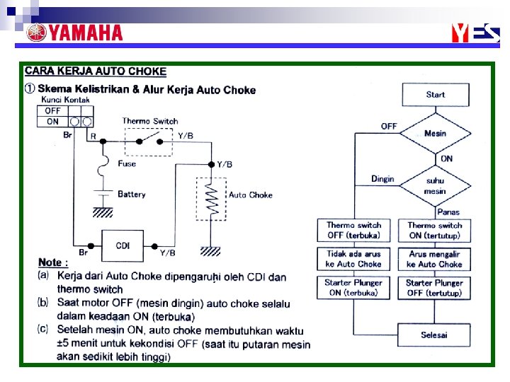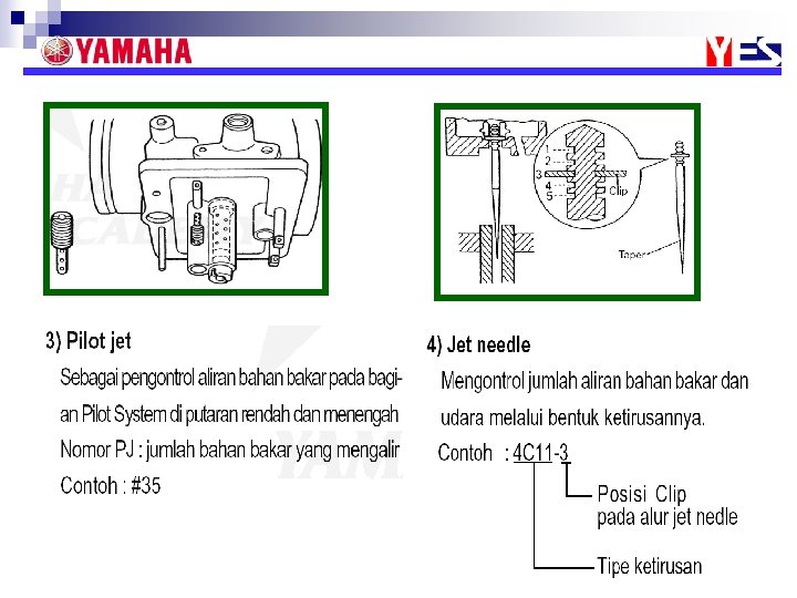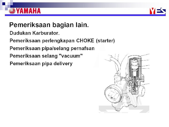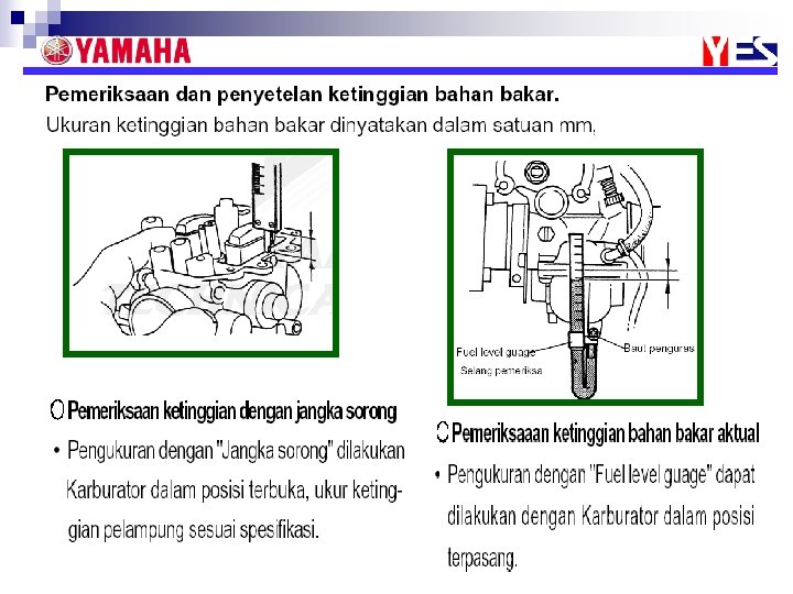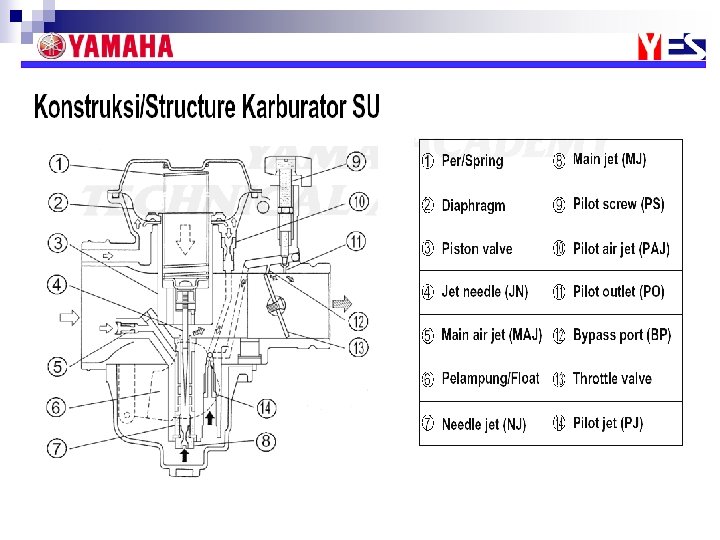 KARBURATOR SU Pilot Screw dan Pilot Air Screw Diputar ke arah Mengontrol Kanan Kiri Pilot Screw (SU) Jumlah campuran bensin + udara Pilot Air Screw (VM) Jumlah udara Jumlah campuran berkurang Campuran menjadi kaya Jumlah campuran bertambah Campuran menjadi kurus Menyetel Pilot screw : • Putar Pilot Screw kekiri atau kekanan 900 • Cari putaran rpm tertinggi. • Lalu turunkan putaran mesin (rpm) sesuai standar dengan memutar stop screw