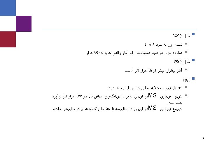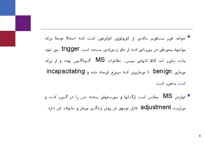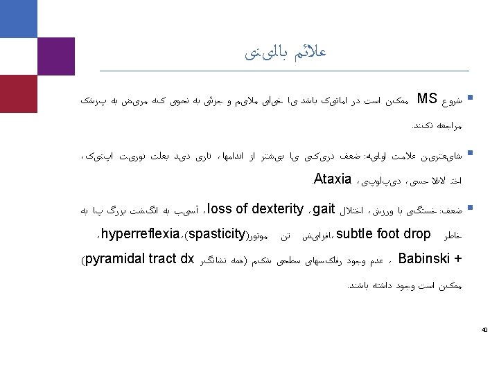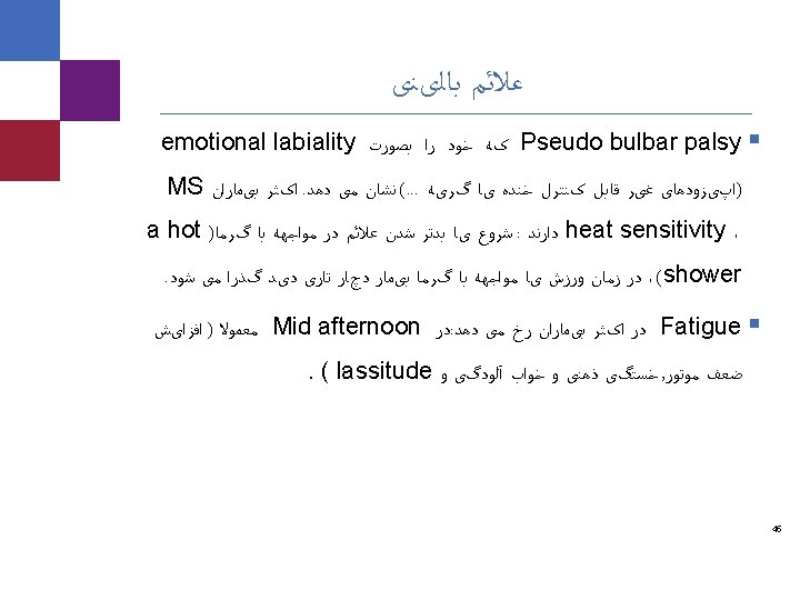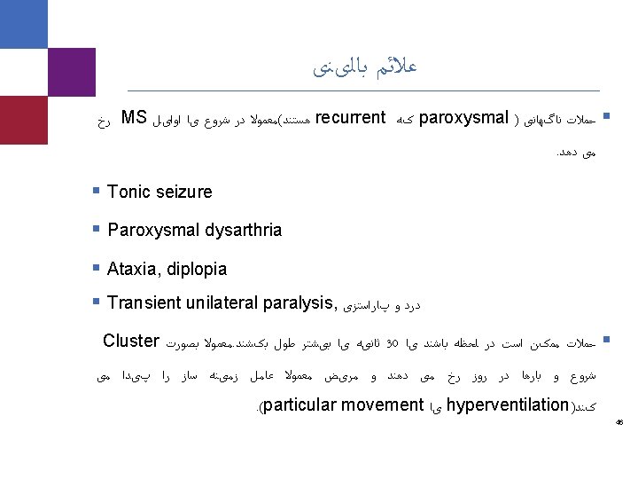 ﻋﻼﺋﻢ ﺑﺎﻟیﻨی ﻋﻠﺖ ﺑﻪ ﻧﺪﺭﺕ ﺑﻪ ﺳﺎﻝ 50 ﺑﺎﻻی ﺍﻟﺒﺘﻪ کﻪ facial pain)Trigeminal neuralgia § (. ﺍﺳﺖ پﺎﺗیک ﺍیﺪیﻮ ﻭ ﺍﺳﺖ MS § Onset in young age § Bilateral § Objective facial sensory loss § Constant rather than paroxysmal pain trigeminal neuralgia ﺩﺭ ﺍﺳﺖ MS ﻧﻔﻊ ﺑﻪ ﺑﺎﻻ ﻣﻮﺍﺭﺩ § 42 Caremark proprietary and confidential information. Not for distribution.