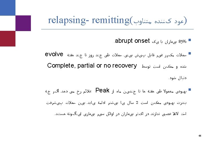 Factors Affecting Prognosis § Favorable § Low attack rate § Long interval to second attack § Complete recovery from first attack § Younger age at onset § Female sex § Low disability at 2 and 5 years § Unfavorable § High attack rate § Short interval to second attack § Lack of recovery from first attack § Older age at onset § Early cerebellar involvement § Insidious motor onset § Early development of mild disability 65 Caremark proprietary and confidential information. Not for distribution.
