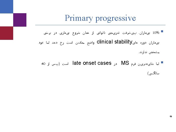 Symptomatic Treatments Problem Spasticity Symptoms Management Painful spasms in the lower and upper limbs Remove irritating factors Physical therapy, baclofen, diazepam, dantrolene Paroxysmal phenomena Trigeminal neuralgia, pain, tonic seizures carbamazepine, Neurontin, phenytoin Fatigue Feeling tired (morning or early afternoon) Energy conservation, amantidine Depression Common, occurs in high percentage of patients Anti-depressants Sexual dysfunction Inability to produce/ sustain an erection Behavioral therapy Viagra Urinary dysfunction Urgency, frequency and retention Detrol, Ditropan, Botox Note, some of the drugs listed are shown for off-label use. This page contains prescription brand drugs that are registered or registered trademarks of pharmaceutical manufacturers that are not affiliated with Caremark proprietary and confidential information. Not for distribution. 79
