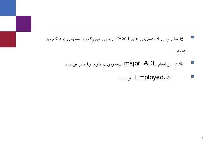 Progression § Relapsing-remitting to secondary progressive § 30% to 40% within six years to 10 years of onset § 58% within 11 years to 15 years § 90% after 25 years § Disability progression § 8 years to moderate disability § 15 years to severe disability 63 Caremark proprietary and confidential information. Not for distribution.