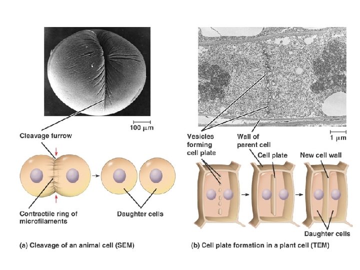 Cytokinesis: • Immediately follows mitosis • Cytoplasm is divided into two cells • In animals, a cleavage furrow develops, pinching the cytoplasm into two parts. • In plants, a cell plate forms across the middle of the cells and separates the two parts.