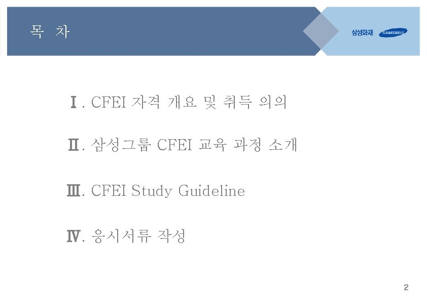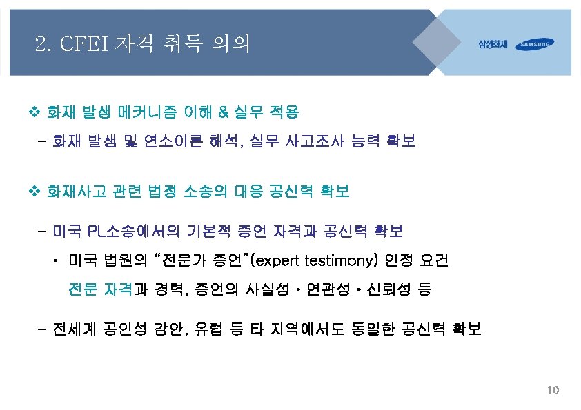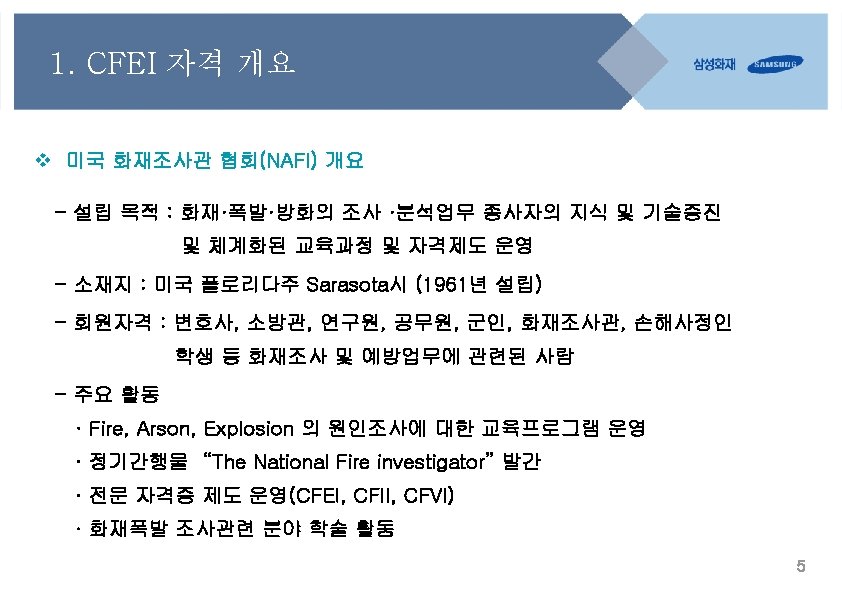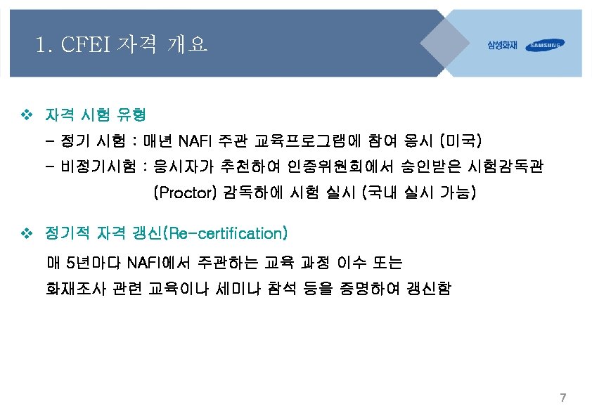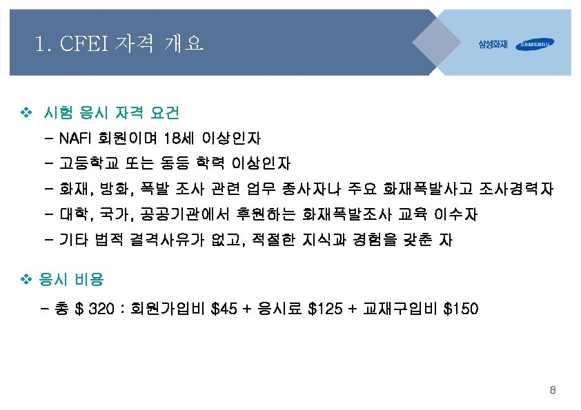 1. CFEI 자격 개요 v 시행근거 : NFPA 921 Section 11. 6. 4 The Association also originated and implemented the National Certification Board. Each year, the Board certifies fire and explosion investigators and fire investigation instructors. - 1982년 NAFI 산하 인증 위원회를 두고 심사와 평가절차를 거쳐 인증하며 화재조사관련전문지식과 분석기술 향상을 도모함 v 자격 취득 절차 : NAFI 회원 가입 ⇒ 개인별 시험신청서 작성 및 제출 ⇒ 사전 자격 심 사 및 승인 ⇒ 자격 취득 시험 실시 ⇒ 합격자 자격 등록 6
