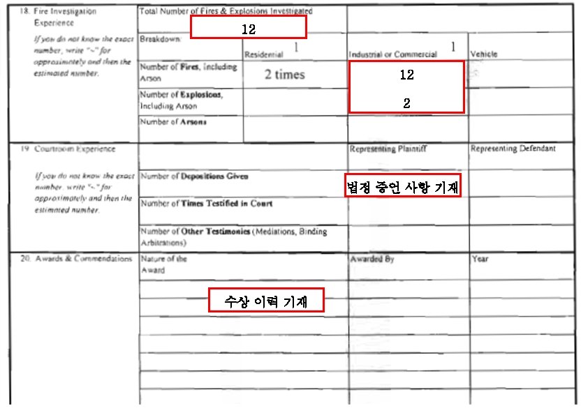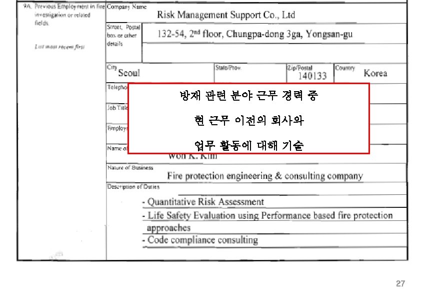 Manager 또는 Assistant Manager 입사일자 현 조직의 부장님 성함 / General Manager 현재 대표 업무 내용을 세부적으로 기술 Management for fire protection, Inspection of fire protection facilities, Fire prevention activity, Fire scene investigation 26