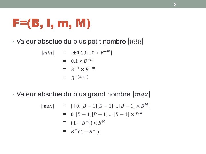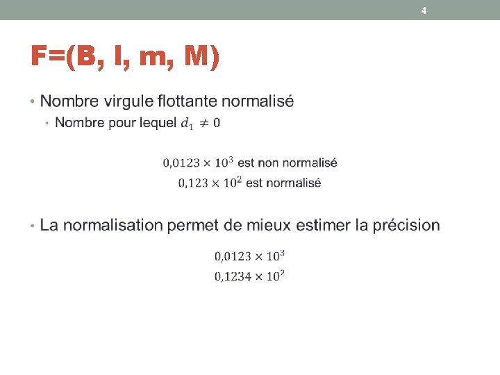 6 F=(B, l, m, M) • Autant de négatifs que de positifs On compte le nombre zéro B-1 possibilité pour le premier chiffre de la mantisse B possibilités pour chacun des l-1 autres chiffres Valeurs possibles pour l’exposant