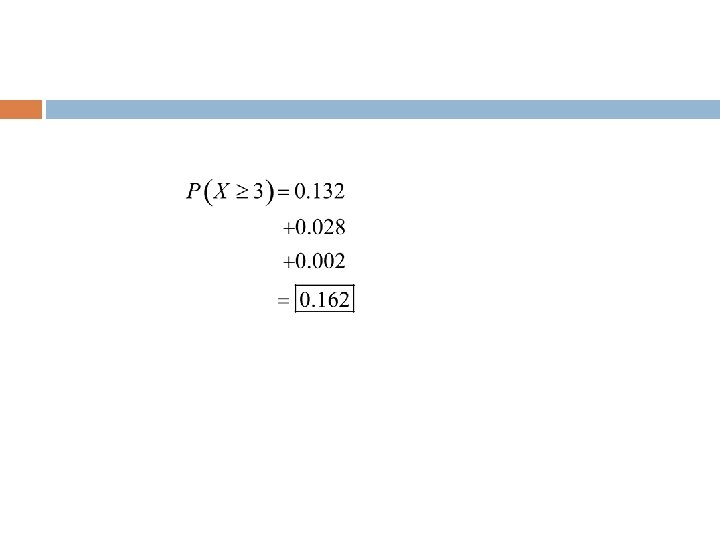 Example 5 -17: Survey on Employment 34 A survey from Teenage Research Unlimited (Northbrook, Illinois) found that 30% of teenage consumers receive their spending money from part-time jobs. If 5 teenagers are selected at random, find the probability that at least 3 of them will have part-time jobs.