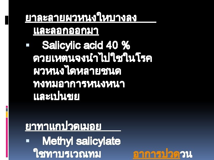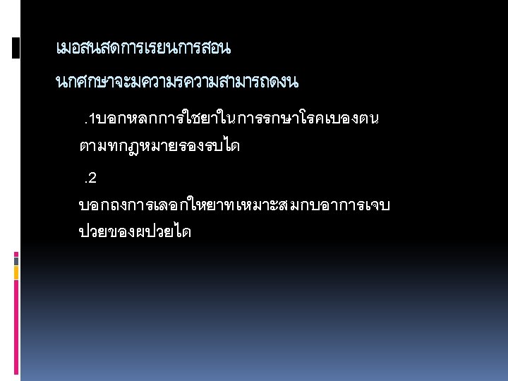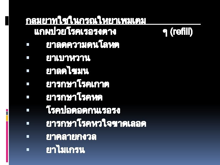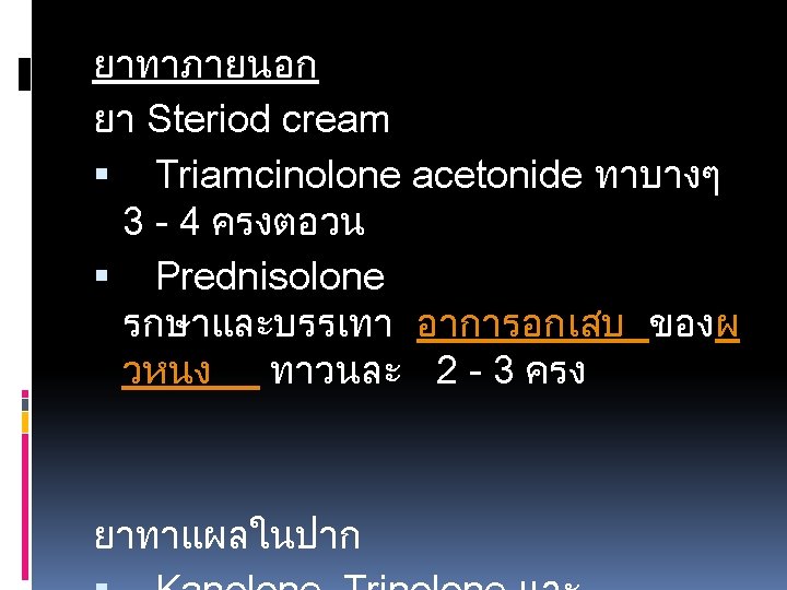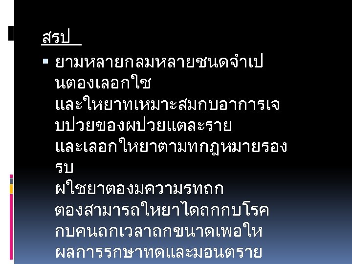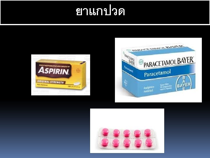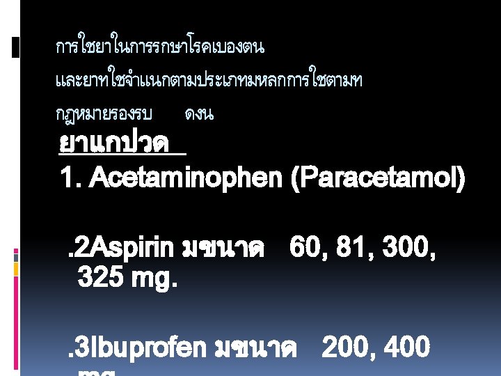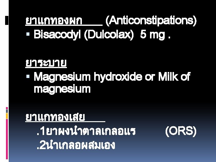 1 Chlorpheniramine CPM 2 Cetirizine 10 mg 3 Slides: 49 Download presentation ยาแกแพ. 1 Chlorpheniramine (CPM). 2 Cetirizine 10 mg. 3. Hydroxyzine 10 25 mg. ยาลดการบวมข องเยอบ (Decongesta nt) Pseudoephe ยาแกแพเฉยบพลน /ชอค (Drug used in Anaphylaxis / Shock) -Epinephrine หรอ Adrenaline ยาฉด (1: 1000)1 mg. /ml. ยาออกฤทธตอระบบทางเดนหา ยใจ )Respiratory Drugs) ยาแกไอ / ขบเสมหะ. 1 Dextromethorphan 15 mg. . 2 Mixt. Tussis (Brown's Mixture) 3. Scill Ammon Mixt. ยาระบบทางเดนอาหาร (Gastrointestinal Drugs) ยาขบลม 1. Simethicone 80 mg. (Air X) 2. Mixt. Carminative. 3 Sodium Bicarbonate ขนาด 300 mg ยาลดกรด (Antacids) 1. Aluminium hydroxide 2. Magnesium hydroxide ยาลดการสรางกรด Ranidine (Ranitidine) ยาแกคลนไสอาเจยน (Anti emetics) 1. Dimenhydrinate )Dramamine) 2. Domperidone )Motilium) ยาลดอาการปวดเกรง (Antispasmodics) วตามน 1. Multivitamin 2. Vitamin B complex 3. Vitamin B 1 4. Vitamin B 2 5. Vitamin B 6 6. Vitamin B 12. 7 Vitamin C ยาเมด 50 100 200 500 mg. ยาบำรงโลหต 1. Ferrous Fumarate ยาเมด 200 mg. 2. Folic acid ยาเมด 0. 5 - ยาถายพยาธ. 1 Albendazole ยาเมด 200 mg. . 2 Mebendazole ยาเมด 100 mg. ยาปฏชวนะ. 1 Amoxycillin (Amoxil. Ibiamox). 2 Penicillin V. . 3 Erythromycin capsule 250 mg. . 4 Cotrimoxazole (Bactrim) ยาเมด 1 เมด ประกอบดวย Sulfamethoxazole 400 mg. และ Trimethoprim 80 mg. 5. Dicloxacillin capsule 500 , 250 mg. . 6 Doxycycline ยาเมดและ capsule 100 mg. ยาฆาหด , เหา, โลน (Scabicides) Benzyl benzoate ทา 24 ชม. ยาแกคน (Antipruritics) Calamine lotion ยาแกคน ยาปายตาปฏชวนะ Oxytetracyclin eye ointment ยาหยอดตากลมแกแพ Antihistamine ยาหยอดตาปฏชวนะ Tetrahydrozoline + Natazoline (Histaoph eye drop) ยาชาเฉพาะท lidocaine 2% ml. ถาเปนแผลทนวมอและเทา หามใชชนดม adrenaline นำยาฆาเชอ (Disinfectant and Antiseptics) Alcohol, Chlorhexidine gluconate (Hibiscrub), Povidone ioline, กลโคสและสารนำ Glucose 50%, D 5% NSS, D 5% N/2, Lactate Ringer’s Solution, 0. 9% NSS ยาปฏชวนะตอตานเชอรา Mycostatin Oral Suspension Vaccine Immunoglobulin Rabies Vaccine
