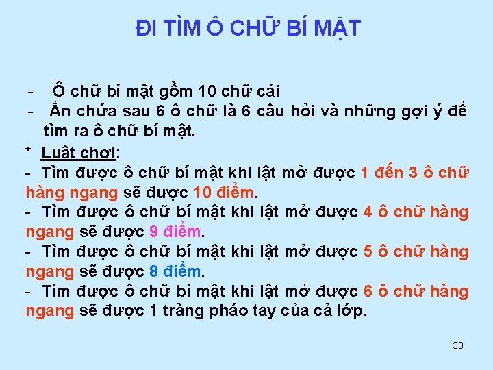 ĐI TÌM Ô CHỮ BÍ MẬT 1 2 3 4 5 6 Có mấy phương pháp gieo trồng phổ biến? Khoảng thời gian nhất định để gieo trồng Phương pháp xử lý hạt giống Ở địa phương em, cây cải bắp được gieo Yếu tố nào có tính quyết định nhất So với các vùng miền trong nước, Miền Bắc có thêm vụ nào? một loại cây nào đó gọi là gì? biến? trồng bằng phương pháp nào? nào được ápgieo dụng phổ đến thời vụ trồng? N Ô N G H I Ệ P 34