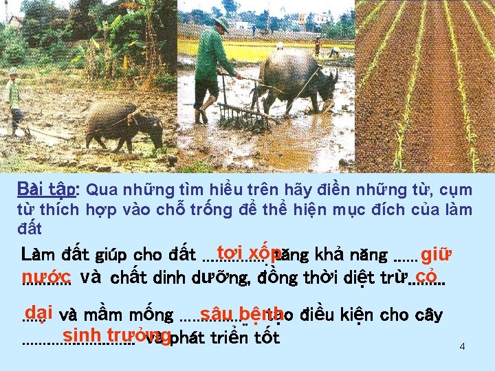 I. Làm đất nhằm mục đích gì ? Giúp cho đất tơi xốp, tăng khả năng giữ nước, chất dinh dưỡng, đồng thời còn diệt trừ cỏ dại và mầm mống sâu bệnh, tạo điều kiện cho cây sinh trưởng, phát triển tốt 3