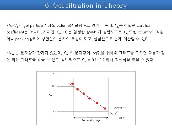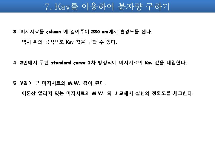 7. Kav를 이용하여 분자량 구하기 2. Standard curve 구하기. Kav = (Ve-Vo) / (Vt-Vo) BSA (66000 Da) , Cytochrome C (12400 Da), Aprotinin (6500 Da) Kav 값과 이미 분자량을 알고 있기에, 이 두 값을 x축, y축으로 curve를 구한다. Vt = packing된 resin의 부피 Vo = void volume, blue dextran 이 나오는 부피 Ve = 단백질이 나오는 부피 EX> Mw(Da) log. Mw Ve (ml) blue Dextran 200000 4. 55 BSA 66000 4. 819544 5. 25 Cytochrome C 12400 4. 093422 7. 35 aprotinin 6500 3. 812913 9. 45 * Blue dextran은 Vo를 측정하기 위함이므로 standard curve에는 포함되지 않는다.