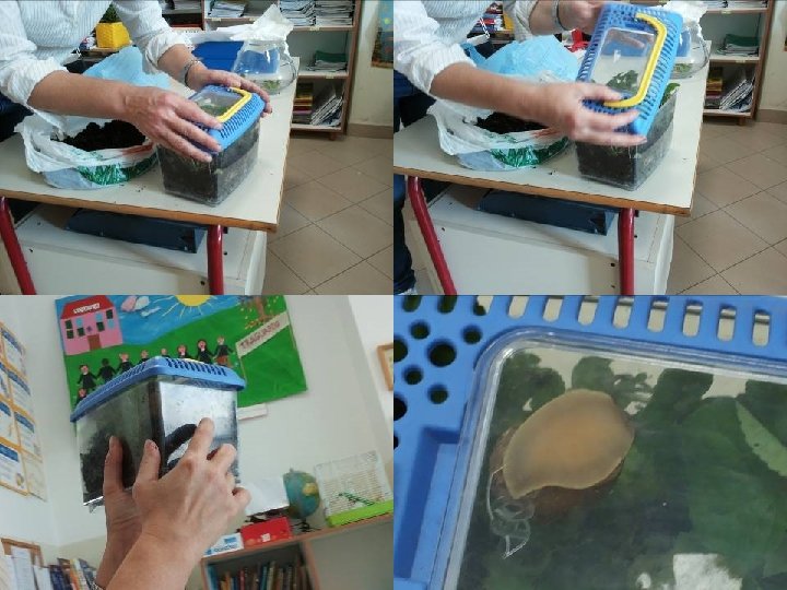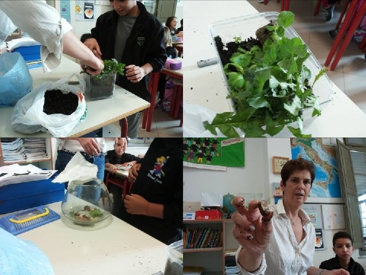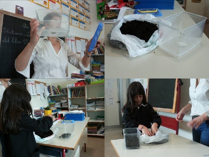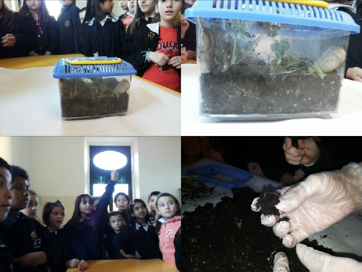 • A seguito delle osservazioni sulla casetta delle chiocciole, i bambini avevano espresso la volontà di controllare se nella terra vivessero altri animaletti. • La terra è stata rovesciata ed osservata con molta attenzione: è stata scoperta una popolazione varia e inaspettata. • I vari animali trovati sono stati fotografati (dai bambini, a turno). • Descrizione individuale scritta e disegno. • Con la lettura ad alta voce delle varie descrizioni, è emerso l’uso nomi diversi riferiti agli stessi animaletti trovati nella terra: bruco, scarafaggio, verme, insetto… • A seguito della discussione collettiva, si decide di cercare la definizione di ognuno in modo da capire quali nomi sia corretto usare. • Viene fatta anche una breve ricerca su Internet per dare un nome ad ogni animaletto. • Produzione di un breve testo condiviso.