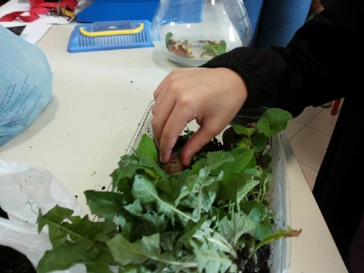 Poi la maestra ha tirato fuori una foglia grandissima e ci abbiamo messo la chiocciola grande e quando ha tirato fuori la testolina e ha cominciato a muoversi abbiamo visto che lasciava una scia di bava. (Tea)