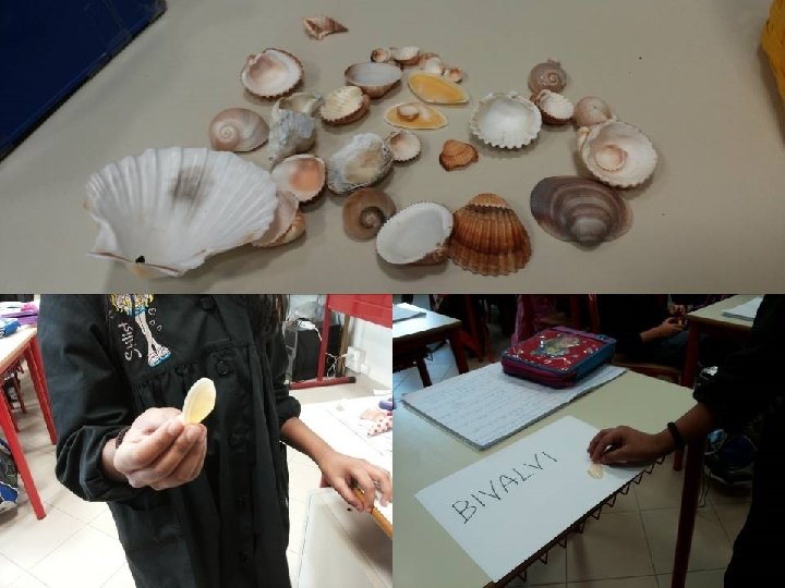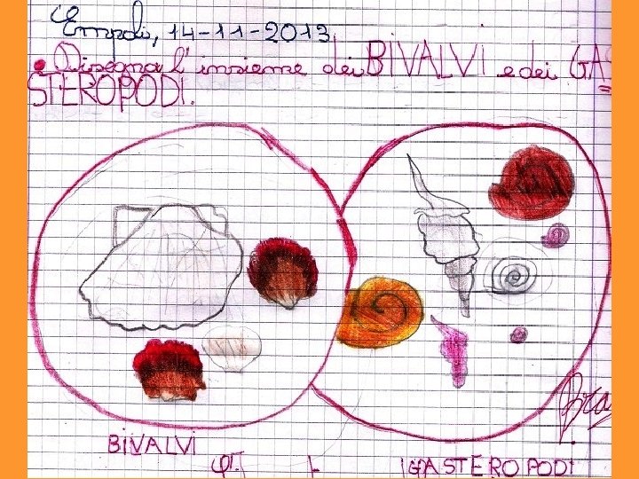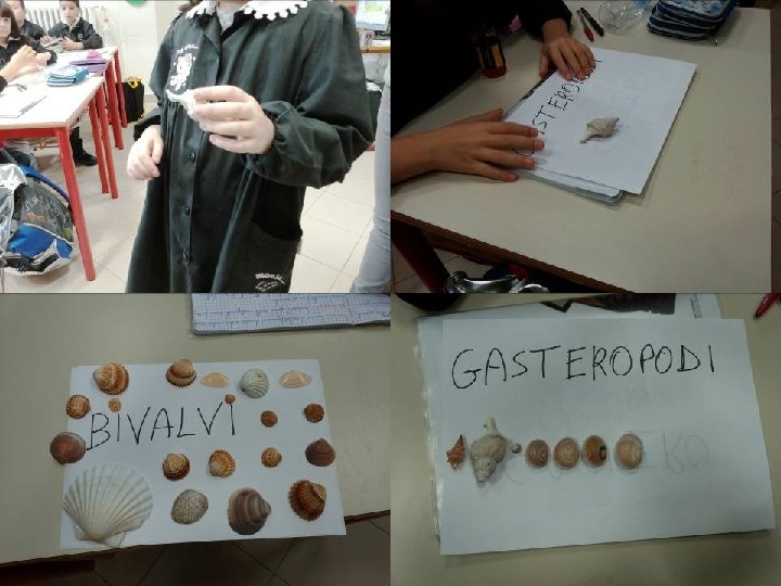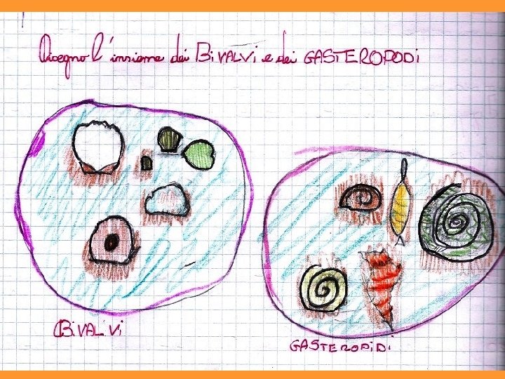• L’approfondimento sui molluschi avvenuto nelle precedenti attività ha dato l’opportunità di parlare di gusci e conchiglie. I bambini ne hanno portate molte in classe e queste vengono sottoposte alla loro osservazione. • Vengono notate differenze e analogie che portano a classificarle in due gruppi diversi. • Emerge anche l’osservazione che animali conchiglie/gusci diverse hanno comportamenti diversi. • Confrontando le caratteristiche di ciascun gruppo con quanto scritto precedentemente viene attribuito a un gruppo il nome “gasteropodi” e all’altro “bivalvi”. • Ciascun bambino pone un elemento all’interno di uno dei due insiemi. (Collegamento interdisciplinare con matematica)
