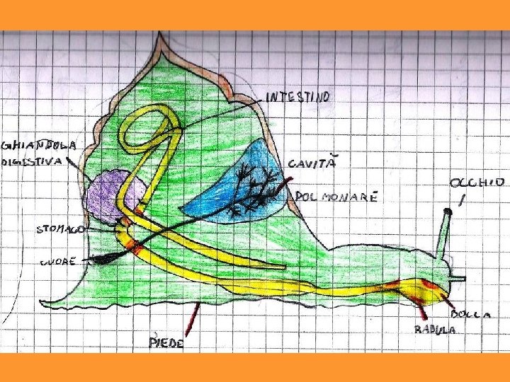 • La popolazione delle chiocciole si è progressivamente accresciuta, perché molti bambini hanno portato nuovi esemplari. Fra questi, c’era una chiocciola con il guscio danneggiato. Questa chiocciola è morta. • Dopo aver constatato la morte della chiocciola, i bambini fanno molte congetture sulle possibili cause. La bambina che l’aveva portata ribadisce che il guscio era rotto. Pian piano tutti riconoscono in questo fatto la causa più probabile della morte, anche se non sanno dare una spiegazione di come il guscio rotto possa aver portato ad una tale conseguenza. • Questo fatto ha dato modo di riflettere sull’importanza del guscio. Attraverso una discussione guidata si arriva a concludere che il guscio protegge gli organi interni. • Produzione di un testo collettivo • I bambini sono curiosi di sapere com’è fatta dentro una chiocciola e se ha organi come gli uomini. • Breve ricerca su Internet e riproduzione grafica.