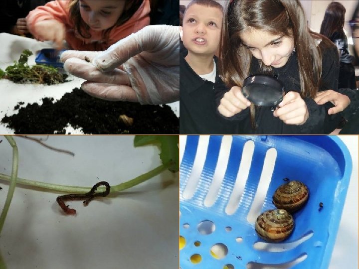 Testo collettivo Noi giovedì 28 siamo andati in un’altra stanza e ci siamo messi intorno ad un grande tavolo: la maestra ha rovesciato la terra della casa delle chiocciole. È stata una giornata indimenticabile perché abbiamo scoperto che c’erano altre creature: l’onisco o porcellino di terra, tanti lombrichi, un centopiedi, una lumachina, una formica, un moscerino…