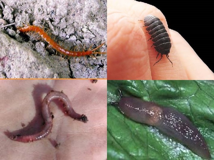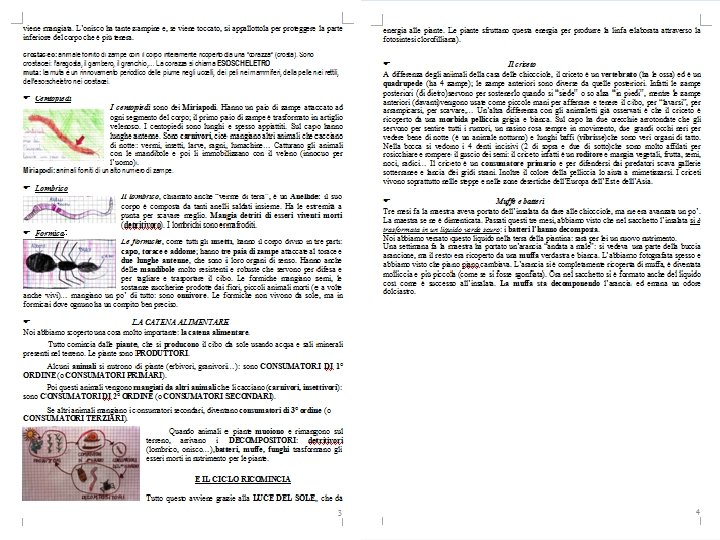 Centopiedi I centopiedi sono dei Miriapodi. Hanno un paio di zampe attaccato ad ogni segmento del corpo; il primo paio di zampe è trasformato in artiglio velenoso. I centopiedi sono lunghi e spesso appiattiti. Sul capo hanno lunghe antenne. Sono carnivori, cioè mangiano altri animali che cacciano di notte: vermi, insetti, larve, ragni, lumachine… Catturano gli animali con le mandibole e poi li immobilizzano con il veleno (innocuo per l’uomo). Lombrico Il lombrico, chiamato anche “verme di terra”, è un Anellide: il suo corpo è composta da tanti anelli saldati insieme. Ha le estremità a punta per scavare meglio. Mangia detriti di esseri viventi morti (detritivoro). I lombrichi sono ermafroditi.