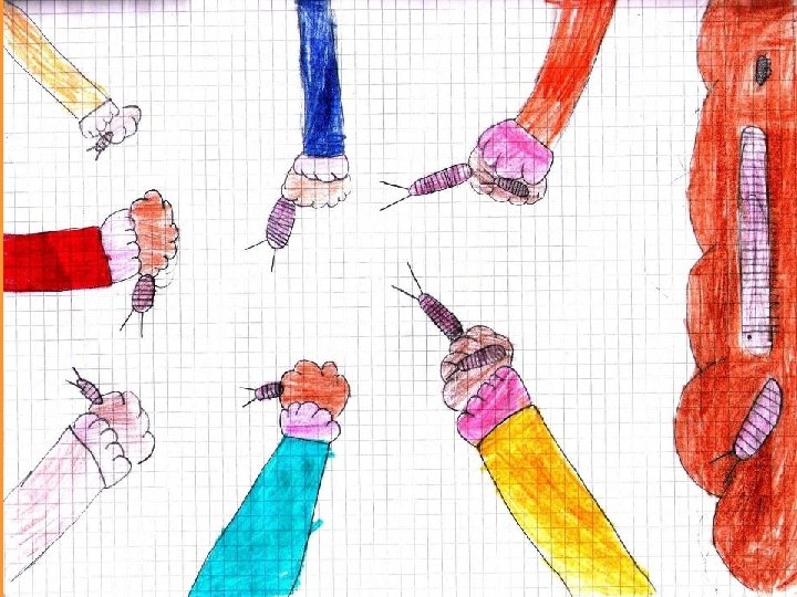 Descrivi e disegna quello che abbiamo scoperto nella terra della “casa” delle chiocciole Nuovi amici vermi – Oggi la maestra ci ha detto di andare in un’altra stanza, per vedere se nella “casetta” delle chioccioline c’erano altri animaletti. Abbiamo versato la casa della chiocciole per vedere nella terra se era vero: abbiamo visto il primo verme che era lungo e secco, aveva il visino rosa e un po’ a punta perché gli serviva per andare sotto terra. Il secondo verme era più ciccione e più corto e era di un colore marrone. Gli altri vermi erano quasi tutti uguali al primo e meno erano uguali al secondo. Dopo un po’ ci siamo passati la lente d’ingrandimento e abbiamo visto che alcuni vermi erano di due colori diversi: il rosa per la faccia e il marrone per il corpo. Si muovevano strisciando, prima il viso e dopo il corpo. Alla fine si è visto un verme che andava velocissimo e quasi non riuscivamo a vederlo. Era di un colore marroncino giallo. (Ginevra) Siamo andati in una stanza, dove la maestra ha rovesciato su un tavolo la “casa” delle chiocciole e nella terra c’erano molti vermi: per esempio c’era un verme che, se si spaventava, si chiudeva e formava una pallina. C’era un altro verme che era un po’ rosso e un po’ marroncino e aveva in cima una punta per scavare e abbiamo trovato anche un millepiedi e altri vermi. (Filippo)