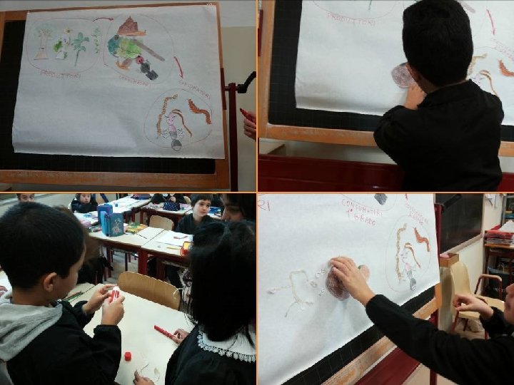 • I bambini a questo punto posseggono conoscenze sufficienti per poter collocare gli animaletti al giusto posto nella catena alimentare. • Ognuno di loro è invitato a disegnare e ritagliare un animale fra quelli osservati o una pianta. • A turno vengono chiamati a disporre SU UN CARTELLONE il loro essere vivente al posto giusto seguendo il criterio: MANGIA, È MANGIATO • Al termine di questa operazione viene completata la CATENA ALIMENTARE presente all’interno della casetta delle chiocciole e vengono dedotti i rapporti fra i vari “anelli”. • Descrizione individuale della catena alimentare rappresentata. • Lettura degli elaborati, discussione collettiva con affinamento delle conoscenze e produzione di un testo condiviso. • Inizio osservazione e documentazione giornaliera di un’arancia ricoperta di muffe per sperimentare l’esistenza di vari tipi di decompositori.