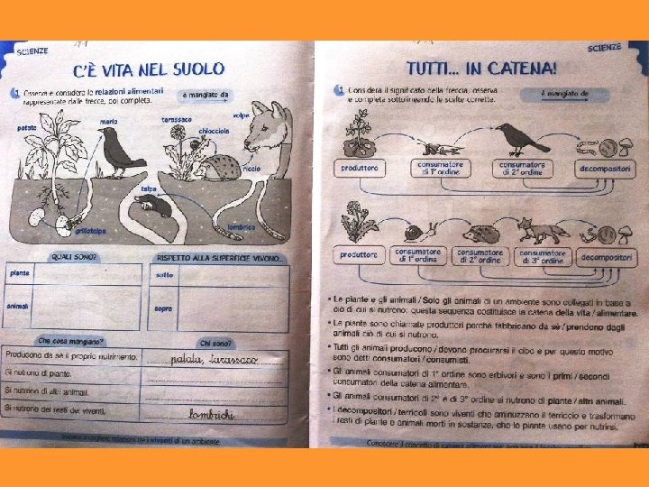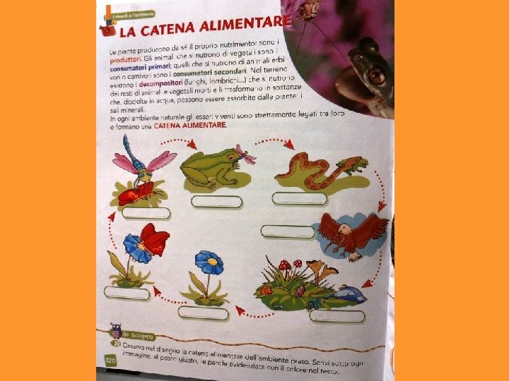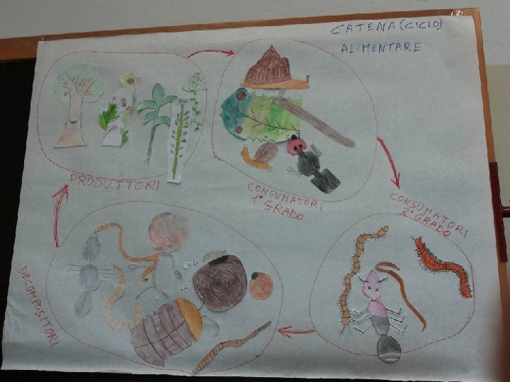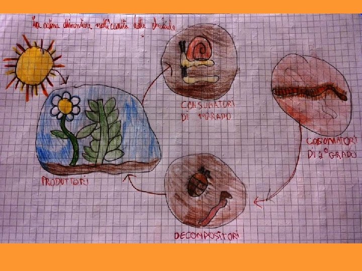 La catena alimentare -Testo collettivo Noi abbiamo scoperto una cosa molto importante: la catena alimentare. Tutto comincia dalle piante, che si producono il cibo da sole usando acqua e sali minerali presenti nel terreno. Le piante sono PRODUTTORI. Alcuni animali si nutrono di piante (erbivori, granivori…): sono CONSUMATORI DI 1° ORDINE (o CONSUMATORI PRIMARI). Poi questi animali vengono mangiati da altri animali che li cacciano (carnivori, insettivori): sono CONSUMATORI DI 2° ORDINE (o CONSUMATORI SECONDARI). Se altri animali mangiano i consumatori secondari, diventano consumatori di 3° ordine (o CONSUMATORI TERZIARI). Quando animali e piante muoiono e rimangono sul terreno, arrivano i DECOMPOSITORI: detritivori (lombrico, onisco…)batteri, muffe, funghi trasformano gli esseri morti in nutrimento per le piante. E IL CICLO RICOMINCIA Tutto questo avviene grazie alla LUCE DEL SOLE, che dà energia alle piante. Le piante sfruttano questa energia per produrre la linfa elaborata attraverso la fotosintesi clorofilliana)
