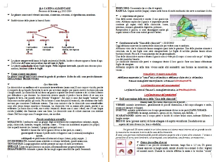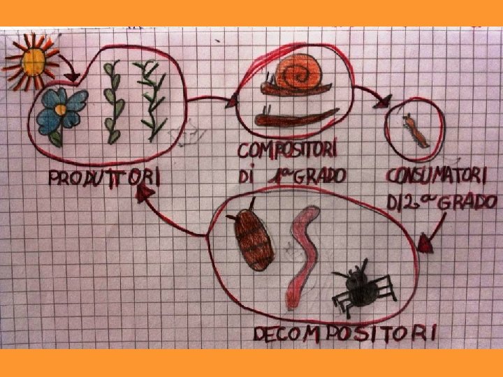 Descrivi la CATENA ALIMENTARE che abbiamo osservato nella“casetta” delle chiocciole Abbiamo visto che le piante danno le sostanze nutritive ai consumatori di primo grado, i consumatori di secondo grado mangiano gli animali che mangiano le piante, i consumatori mangiano altri animali e si trasformano in sostanze nutritive. (Sara) Nella casetta delle chiocciole abbiamo visto che le piantine erano state mangiate dalle chiocciole e dalle lumache. I centopiedi invece mangiano le chiocciole e le lumache. Invece gli altri: l’onisco, il lombrico e la formichina hanno mangiato gli animaletti morti. (Ginevra) Nella catena alimentare ho scoperto che le piante danno il cibo agli animali, che danno il cibo a altri animali, che muoiono e gli altri animali, per esempio l’onisco, i batteri, il lombrico, li trasformano in terra, le piante lo mangiano e ricomincia tutto da capo; è come una catena ed è alimentare ed è per questo che si chiama la catena alimentare. (Ines) Oggi, 9 -1 -2014, abbiamo osservato la catena alimentare. Abbiamo visto i produttori, che sono le piante, ci sono anche i consumatori di 1°grado che sono gli animali che mangiano le piante, ci sono anche i consumatori di 2°grado che sono gli aniamli che mangiano gli animali… Infine ci sono i decompositori e fa tutto un giro. (Raffael)
