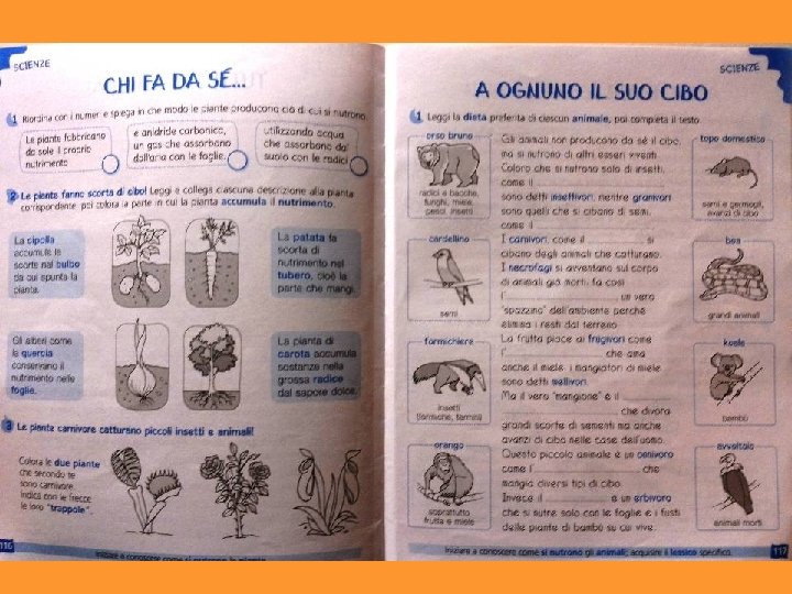 • Breve ricognizione delle conoscenze presenti nei bambini relative al percorso dello scorso anno sulle piante • Puntualizzazione di alcuni concetti chiave inerenti il mondo vegetale tramite discussioni collettive, attività proposte dal libro di testo e produzione di testi individuali. • La nutrizione delle piante: piante discussione collettiva, rappresentazione grafica e produzione di un testo individuale. • Enunciazione della tesi fondamentale per iniziare il percorso di quest’anno: LE PIANTE SONO ORGANISMI PRODUTTORI
