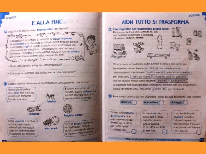 • Nel frattempo continua l’osservazione dei cambiamenti intervenuti nell’arancia ammuffita. • Viene “casualmente” ritrovata anche dell’insalata lasciata chiusa in un sacchetto tre mesi prima. • Osservazione, descrizione e discussione collettiva. • Al termine del periodo di osservazione dell’arancia: descrizione individuale, discussione collettiva con affinamento dei concetti e produzione di un testo condiviso. • Verifica delle conoscenze acquisite ed esportazione delle stesse in altri contesti, utilizzando anche i libri di testo. • Al termine del percorso, i testi prodotti vengono raccolti in un fascicolo riassuntivo da consegnare a ciascun bambino: questo andrà a costituire il “libro di testo” di scienze da studiare e consultare. Ogni bambino lo personalizza disegnando la propria copertina.
