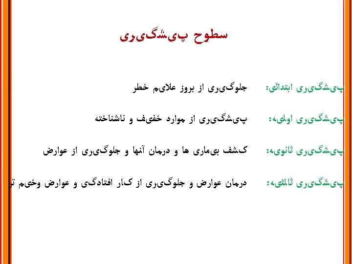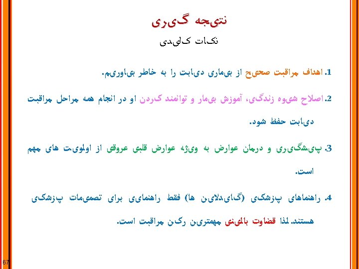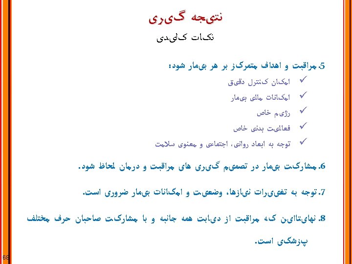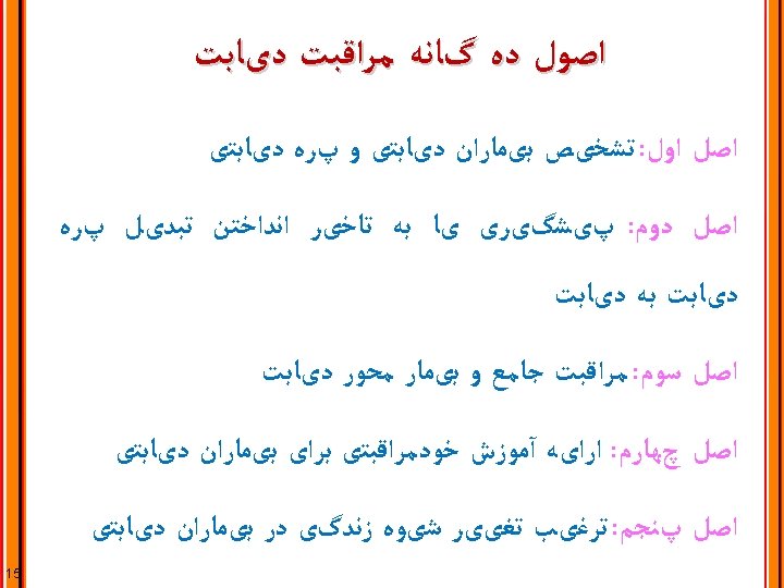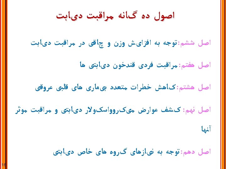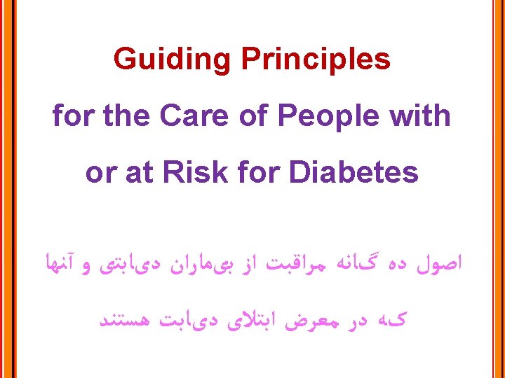 PRINCIPLE 3: Provide Comprehensive, Patient-centered Diabetes Care ﻣﺮﺍﻗﺒﺖ ﺟﺎﻣﻊ ﻭ ﺑیﻤﺎﺭ ﻣﺤﻮﺭ ﺩیﺎﺑﺖ : ﺍﺻﻞ ﺳﻮﻡ Consideration of health literacy and numeracy Consideration of patient-self-management resources Comprehensive management of comorbid conditions: Depression, congnitive impairment, cancer, periodontal disease, liver disease, hearing loss, obstructive sleep apnea, osteoarthritis, infectious diseases