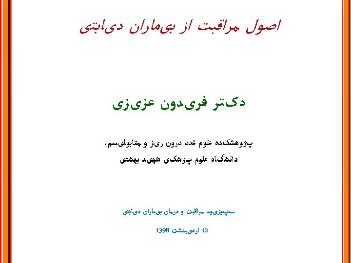 PRINCIPLE 4: Provide Ongoing Self-management Education and Support for People with Diabetes ﺍﺭﺍیﻪ آﻤﻮﺯﺵ ﺧﻮﺩﻣﺮﺍﻗﺒﺘی ﺑﺮﺍی ﺑیﻤﺎﺭﺍﻥ ﺩیﺎﺑﺘی : ﺍﺻﻞ چﻬﺎﺭﻡ Definition and purpose of diabetes self management education & support (DSMES) to understand, implement and sustain self management How to provide DSMES? Community based and other resources.