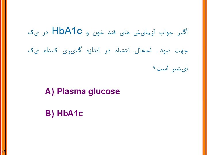 PRINCIPLE 7: Individualize Blood Glucose Management for People with Diabetes ﻣﺮﺍﻗﺒﺖ ﻓﺮﺩی ﻗﻨﺪ ﺧﻮﻥ ﺩیﺎﺑﺘی ﻫﺎ : ﺍﺻﻞ ﻫﻔﺘﻢ Benefits of blood glucose control Risks of blood glucose control Glycemic treatment goals Limitations of A 1 c Blood glucose management strategies Blood glucose assessment