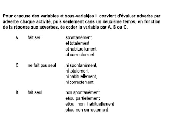 Spontanément : sans stimulation ou incitation Totalement : l’ensemble des activités du champ analysé est réalisé Habituellement : fait référence au temps et à la fréquence de réalisation, chaque fois que c’est nécessaire Correctement : fait référence à la qualité de la réalisation, la conformité aux usages et la sécurité vis-à-vis de soi et des autres Le codage C correspond pour une activité, à une personne qui ne fait jamais cette activité seule même partiellement et même difficilement. Il faut faire l’activité à la place de la personne ou faire ou encore refaire, en totalité et à chaque fois.