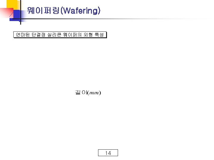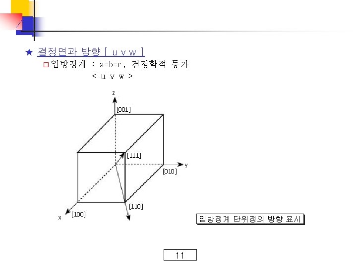 웨이퍼링(Wafering) ★ 절단 작업(sawing operation) o Alphanumeric dot-matrix (laser이용) o 두께 조정(Al 2 O 3 및 glycerine 연마제) o 모서리(edge) 평탄화 작업 및 식각 o 화학적- 기계적 연마(polishing) sodium hydroxide 및 Si. O 2(~100Å)입자 o 에피층 성장 (필요한 경우) (111) (100) p-Type n-Type 90° 45° (110) 180° (110) 실리콘 웨이퍼의 평면선(flat) 10 생능출판사