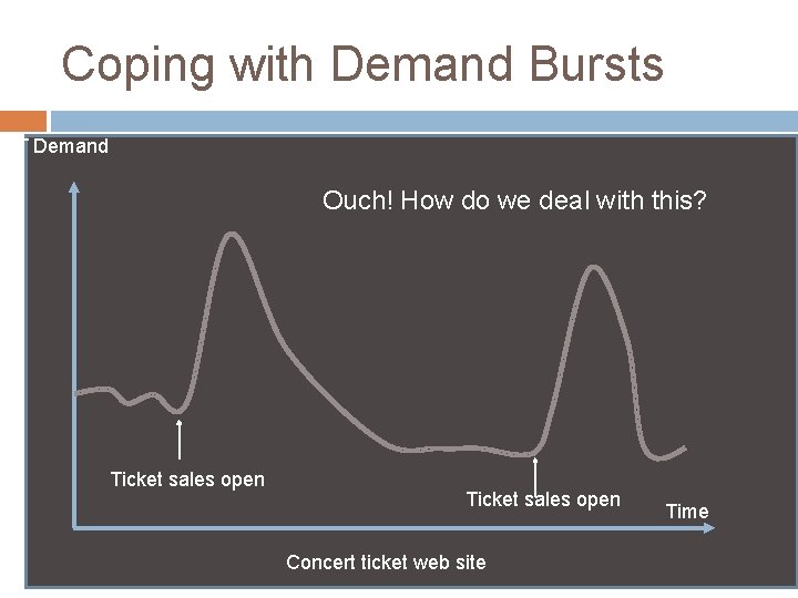 Coping with Demand Bursts IT Demand Ouch! How do we deal with this? Ticket sales open Concert ticket web site Time