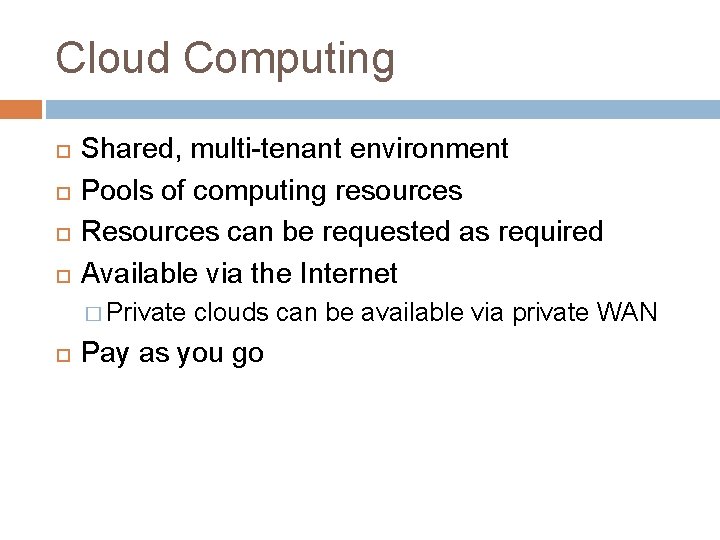 Cloud Computing Shared, multi-tenant environment Pools of computing resources Resources can be requested as required Available via the Internet � Private clouds can be available via private WAN Pay as you go