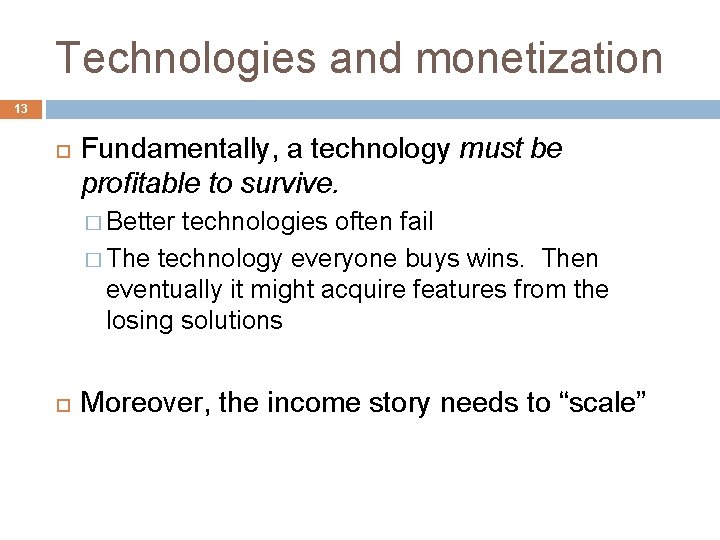Technologies and monetization 13 Fundamentally, a technology must be profitable to survive. � Better technologies often fail � The technology everyone buys wins. Then eventually it might acquire features from the losing solutions Moreover, the income story needs to “scale”