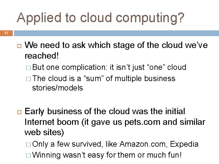 Applied to cloud computing? 17 We need to ask which stage of the cloud we’ve reached! � But one complication: it isn’t just “one” cloud � The cloud is a “sum” of multiple business stories/models Early business of the cloud was the initial Internet boom (it gave us pets. com and similar web sites) � Only a few survived, like Amazon. com, Expedia � Winning wasn’t easy for them or much fun!