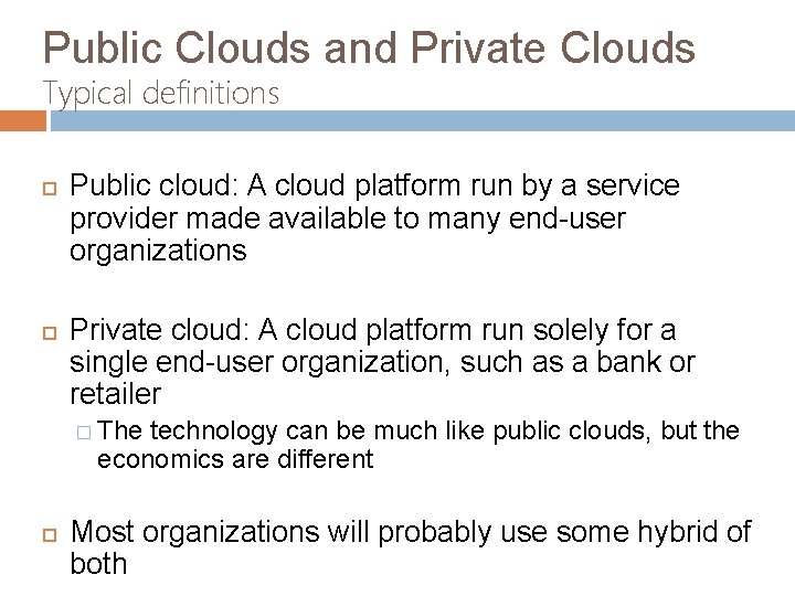 Public Clouds and Private Clouds Typical definitions Public cloud: A cloud platform run by a service provider made available to many end-user organizations Private cloud: A cloud platform run solely for a single end-user organization, such as a bank or retailer � The technology can be much like public clouds, but the economics are different Most organizations will probably use some hybrid of both